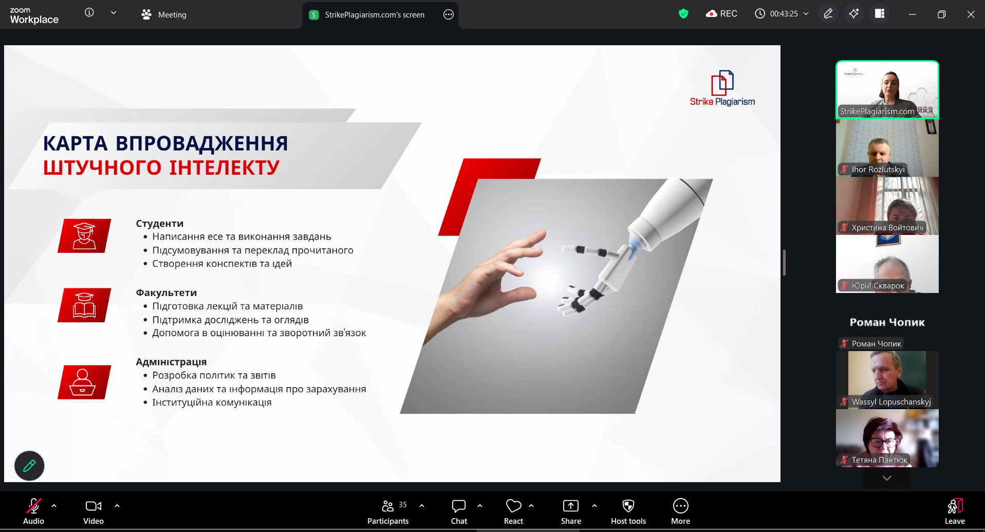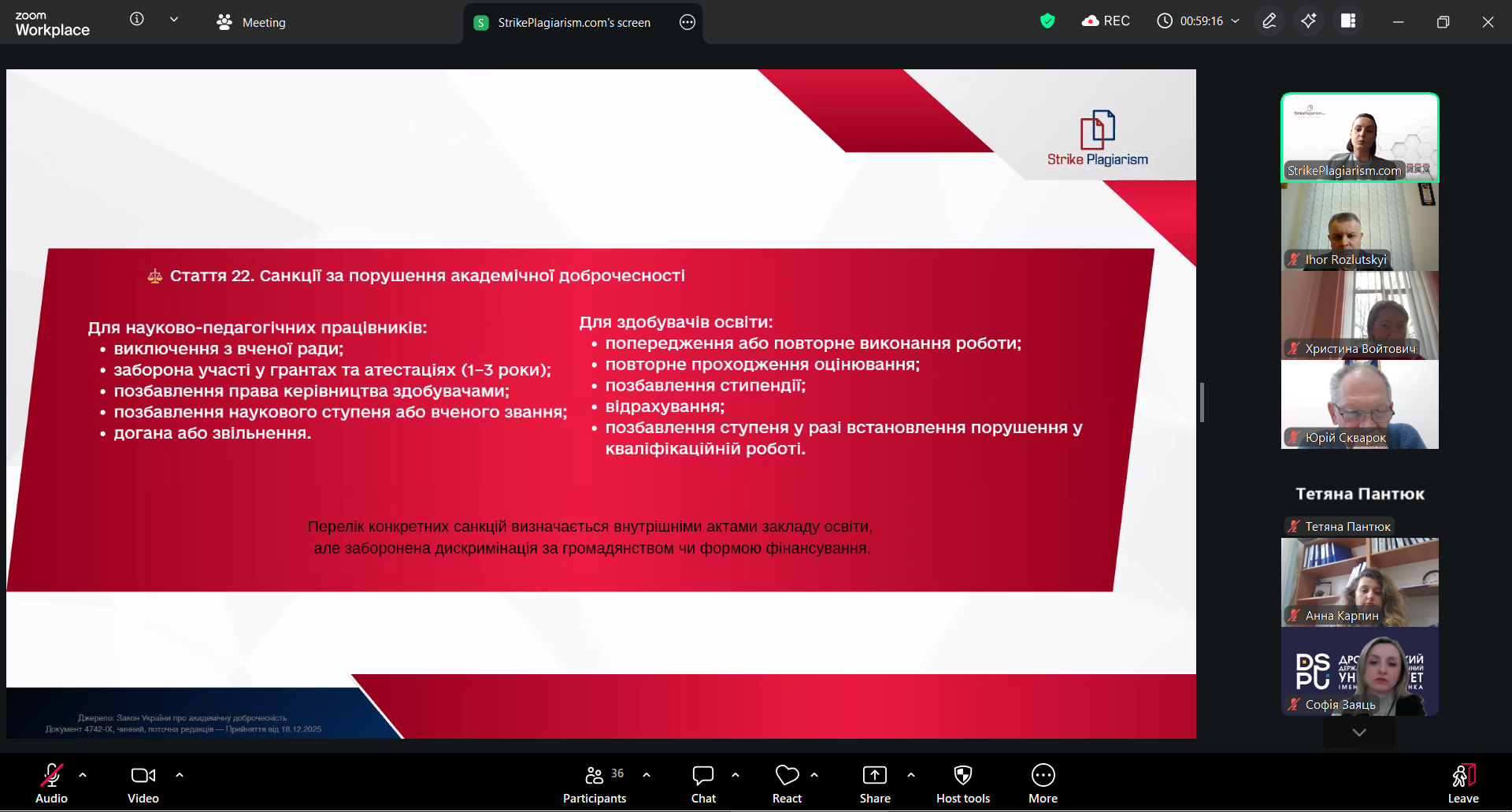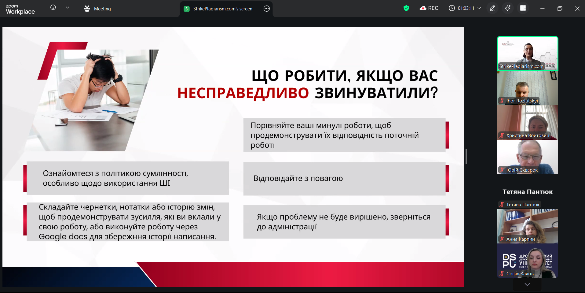 6 квітня в Дрогобицькому державному педагогічному університеті імені Івана Франка разом з організацією SrikePlagiarism відбувся вебінар на тему «Презентація оновленої системи StrikePlagiarism.com» за участі представниці компанії: менеджерки з розвитку Дар’ї Іванової.