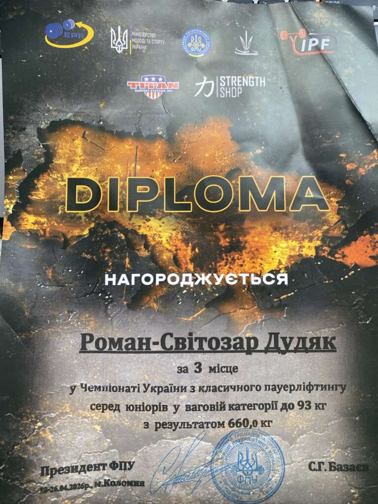 У ваговій категорії до 93 кг серед юніорів Роман-Світозар Дудяк, студент факультету здоров’я людини та природничих наук Дрогобицького державного педагогічного університету імені Івана Франка, посів 3 місце з результатом 660 кг. Роман-Світозар Дудяк отримав дві медалі в окремих вправах: 3 місце в дисципліні «присідання» з результатом 242,5 кг і 3 місце в дисципліні «жим лежачи» з результатом 157,5 кг. Підготував спортсмена випускник факультету здоров’я людини та природничих наук Дрогобицького університету Андрій Журавчак.