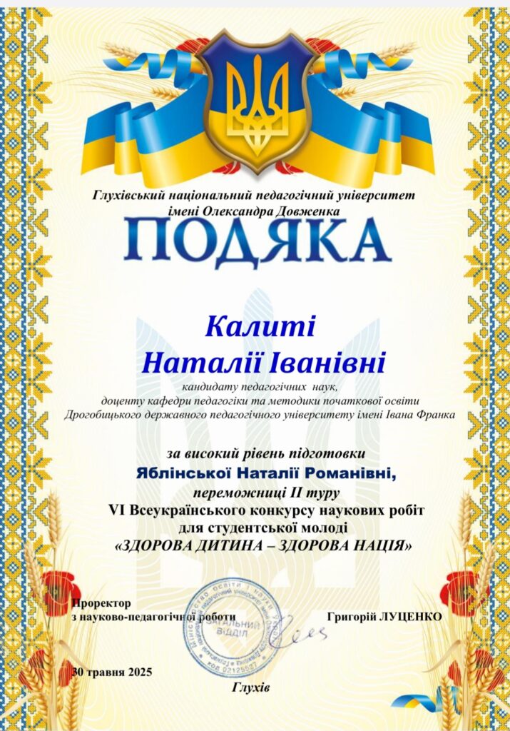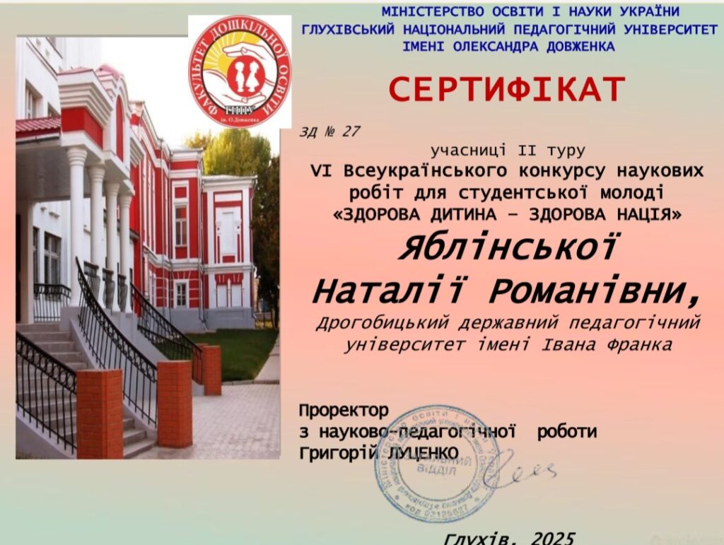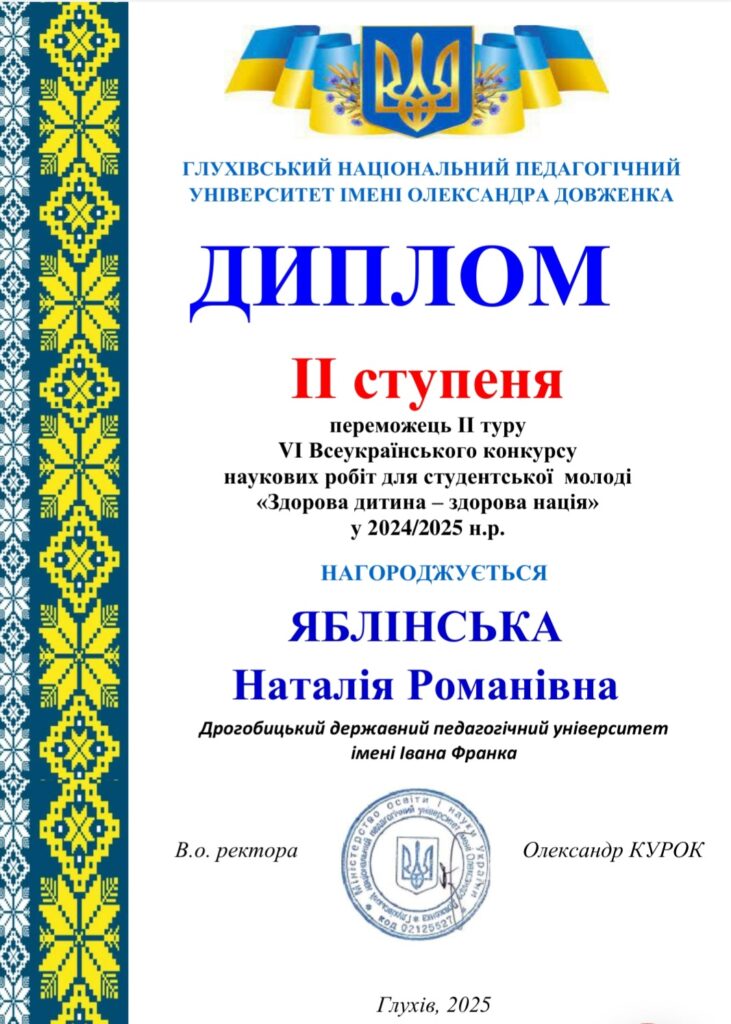 Наталія Яблінська, студентка факультету початкової освіти та мистецтва Дрогобицького педагогічного університету, відзначена дипломом як переможниця другого туру VІ Всеукраїнського конкурсу наукових робіт для студентської молоді «Здорова дитина – здорова нація».