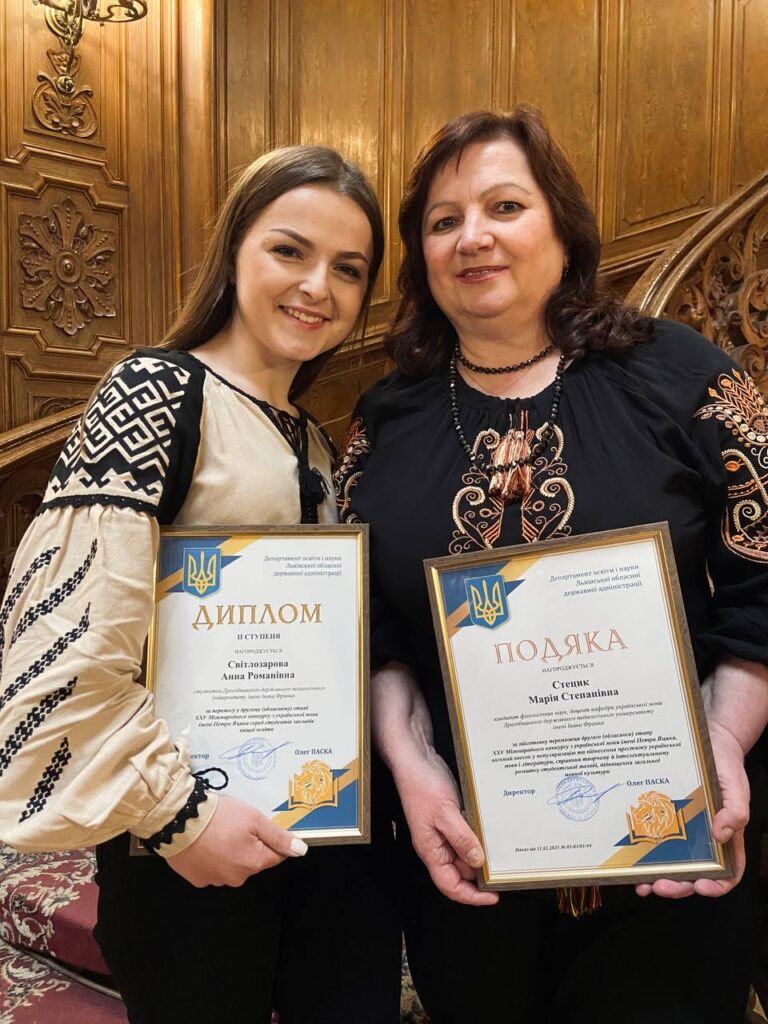 За перемогу в обласному етапі XV Міжнародного мовно-літературного конкурсу учнівської та студентської молоді імені Тараса Шевченка дипломами ІІ ступеня та подарунком департаменту освіти і науки Львівської обласної державної адміністрації була відзначена студентка факультету початкової освіти та мистецтва Вікторія Гірняк, а також її керівниця, кандидатка філологічних наук, доцентка кафедри фундаментальних дисциплін початкової освіти в початковій школі Анна Огар.