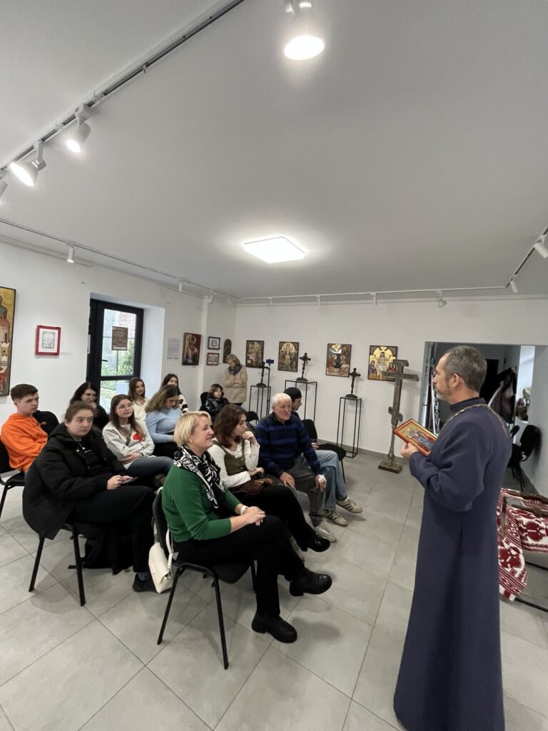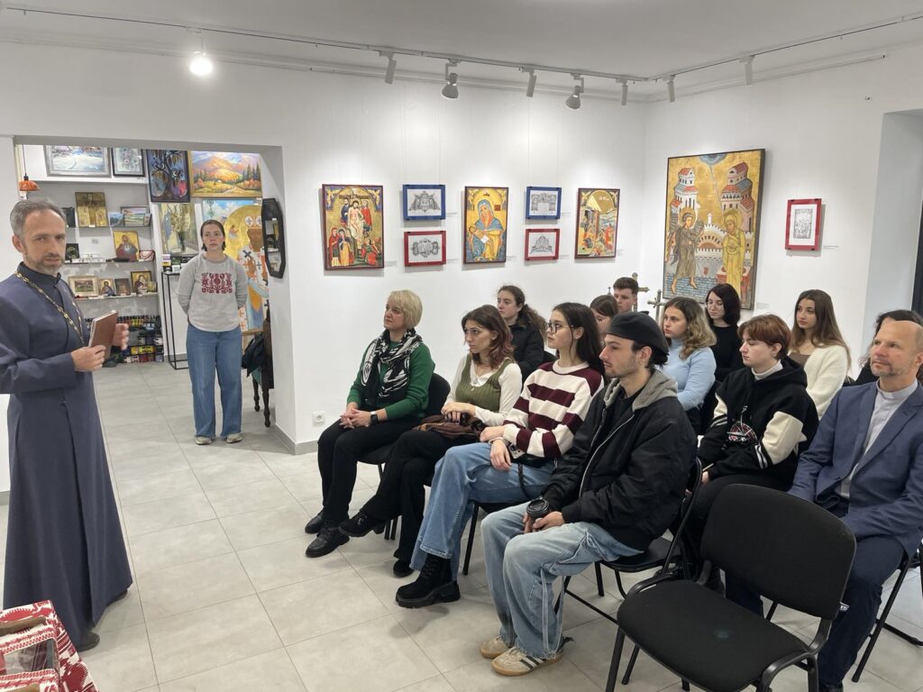 Декан факультету церковного мистецтва о. Михайло Олійник провів для присутніх змістовну кураторську екскурсію, під час якої розповів про витоки та традиції сакрального мистецтва, розкрив духовний вимір іконопису та представив експоновані твори. Іконописець Марія Ковальська розповіла про техніку й технологію темперного живопису, що здавна використовується в іконописі, та показала процес роботи над іконою. Адже іконопис – це не просто мистецтво, а молитва, втілена у кольорі й символах, що несе глибокий духовний зміст та спонукає до внутрішнього споглядання. Через ікону відкривається простір, де мистецтво перетворюється на шлях віри й просвітлення.
