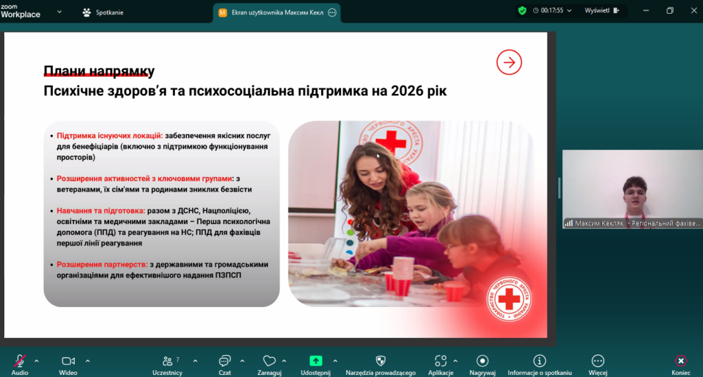 Під час виступу було представлено системний аналіз актуальних напрямів діяльності Червоного Хреста в Україні і на Львівщині з акцентом на реалізації гуманітарних програм, наданні психосоціальної підтримки, розвитку волонтерського руху, впровадженні освітніх ініціатив із поширення знань міжнародного гуманітарного права, а також реагуванні на виклики, зумовлені умовами воєнного стану. Окрему увагу приділено характеристиці механізмів міжвідомчої та міжсекторальної взаємодії організації з органами державної влади, місцевого самоврядування, закладами освіти та інститутами громадянського суспільства, що забезпечує цілісність і безперервність надання соціальних послуг різним категоріям населення.