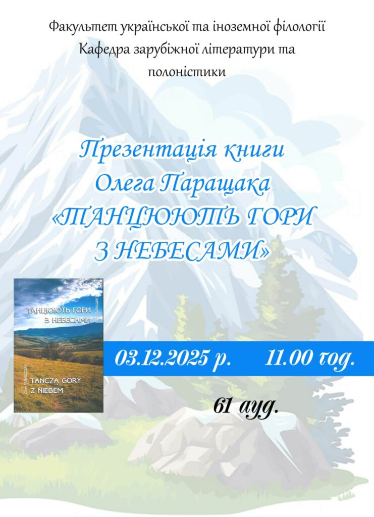 На факультеті української та іноземної філології відбувся особливо теплий і натхненний літературний вечір – презентація поетичної збірки Олега Паращака «Танцюють гори з небесами». Подія перетворилася на справжній діалог культур, адже поезії автора прозвучали не лише українською, а й у польських перекладах, створених студентами та викладачами факультету.