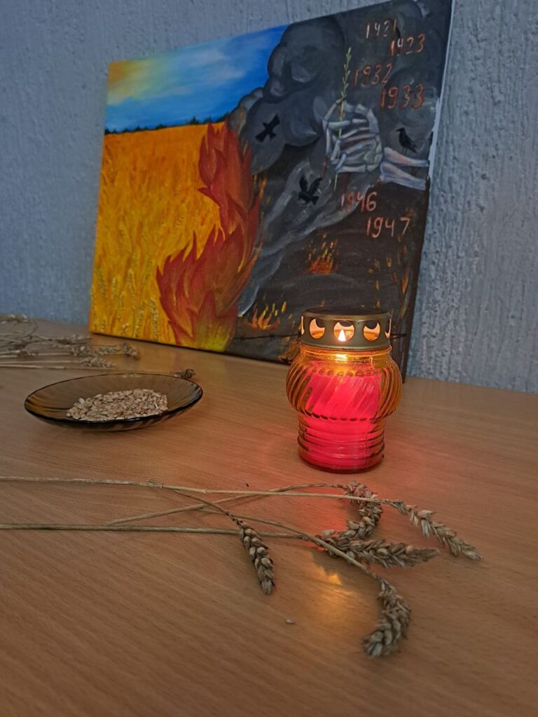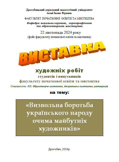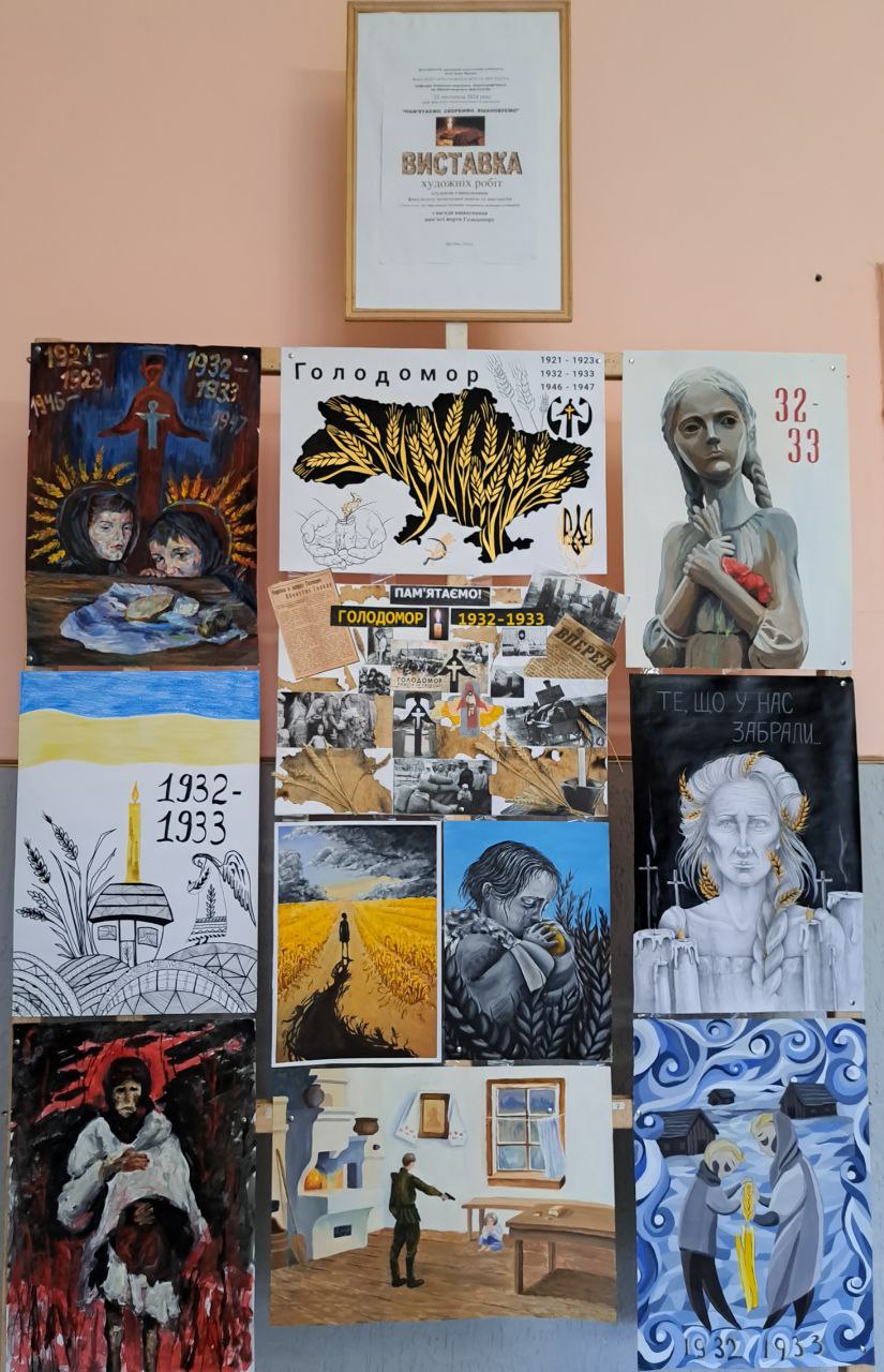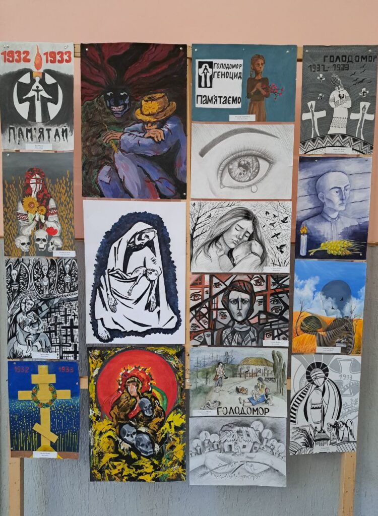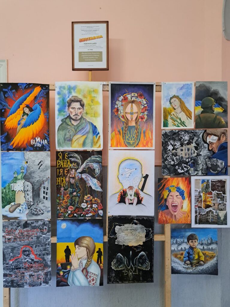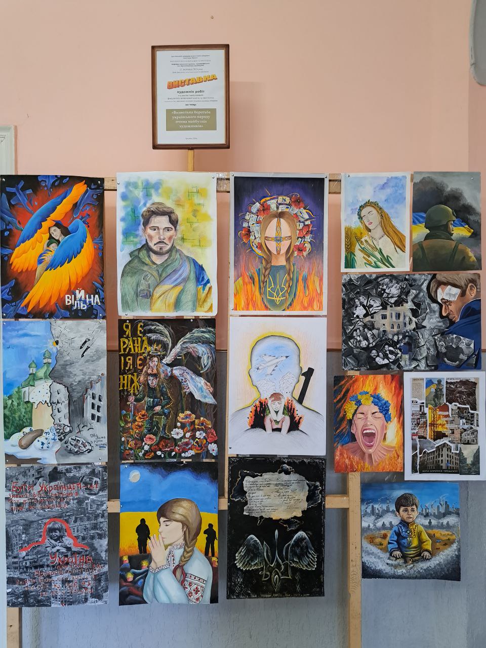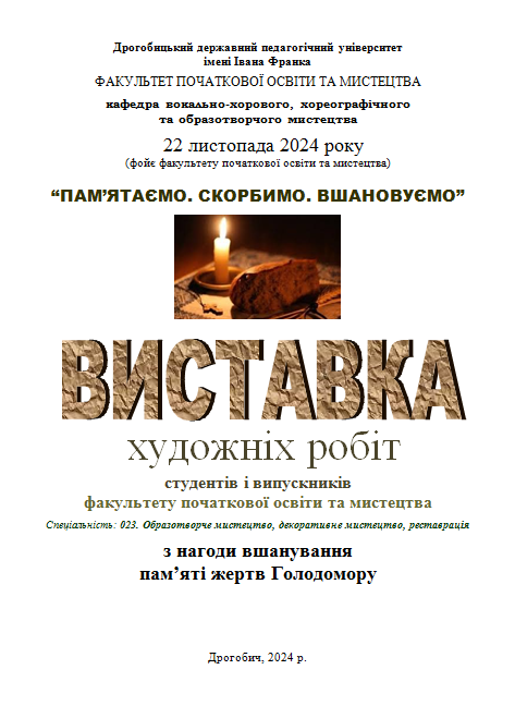Цей та ще багато інших графічних, живописних, колажних творів, виконаних здобувачами спеціальності «023. Образотворче мистецтво, декоративне мистецтво, реставрація», експонуються одразу на двох виставках, які відкрилися 22 листопада на факультеті початкової освіти та мистецтва (вул. Івана Франка, 36). Одна із цих виставок представляє роботи студентів і випускників цієї спеціальності, які виконані під тематикою «Визвольна боротьба українського народу очима майбутніх художників». Тут на особливий індивідуальний лад унаочнені спричинені нинішньою війною біль, страждання, страх й інші жахіття, які сьогодні відчуває і проживає український народ. Друга виставка приурочена вшануванню пам’яті жертв Голодомору в Україні. У представлених тут творах провідною лінією виступає гасло «Пам’ятаємо. Скорбимо. Вшановуємо».