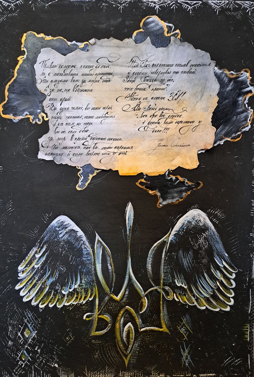 «Привіт солдате, я пишу до тебе…». Цими словами розпочинається авторський вірш студентки третього курсу факультету початкової освіти та мистецтва Ірини Олійник, який є ключовим елементом її творчої графічної роботи, присвяченої на підтримку наших Збройних Сил у боротьбі проти російського окупанта.