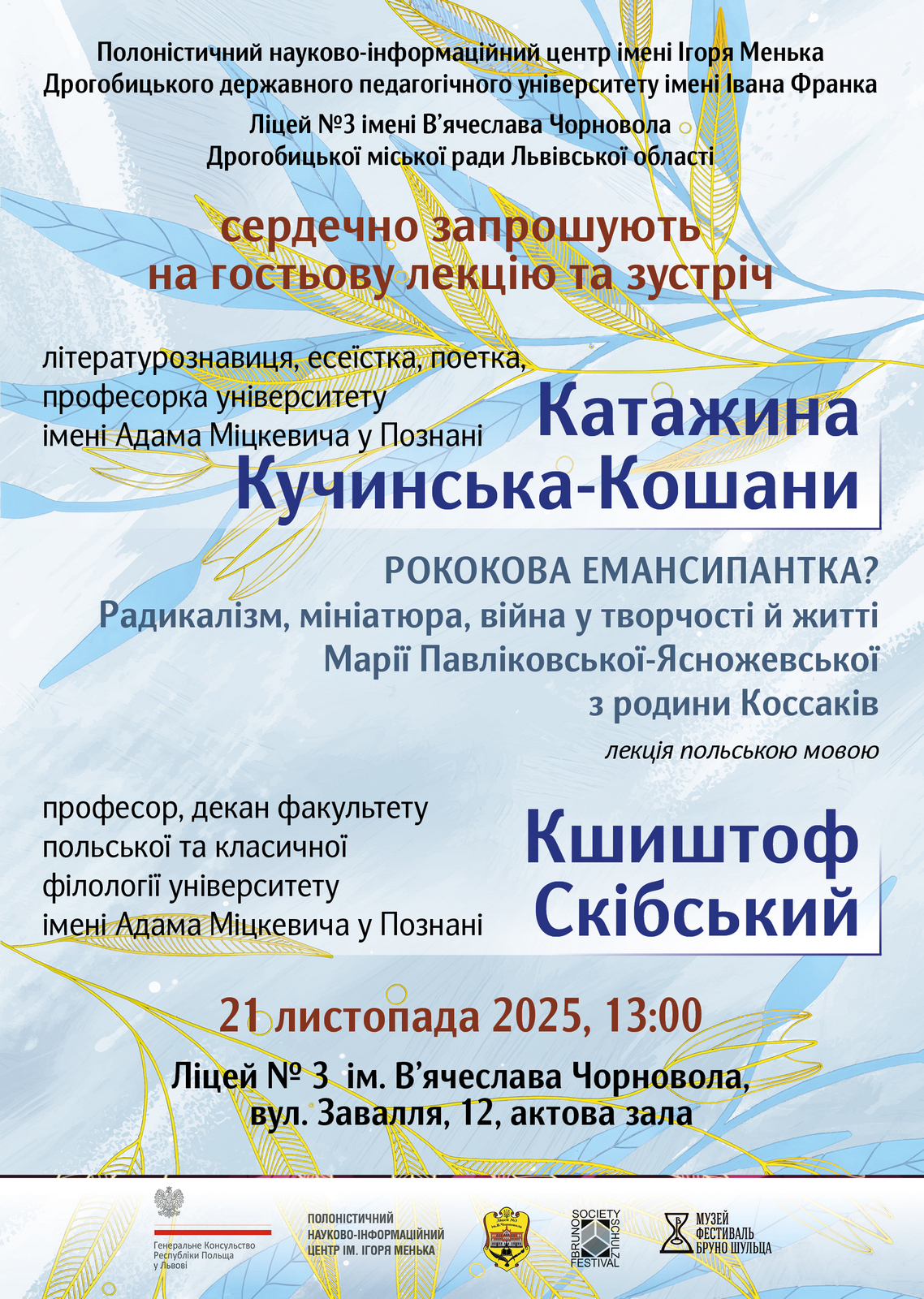 Першу демонстрацію того, у чому полягатиме робота з патронажним класом у Дрогобицькому ліцеї № 3, було зроблено професоркою Катажиною Кучинською-Кошани, яка 21 листопада прочитала в актовій залі ліцею блискучу лекцію для учнівської молоді, учителів та запрошених викладачок з кафедри зарубіжної літератури та полоністики й студентів-полоністів Дрогобицького університету. Лекція була присвячена мало відомій в Україні польській поетці минулого сторіччя Марії Павліковській-Ясножевській, життя якої було неймовірно насиченим і водночас вельми драматичним, а її творчість не оминули теми війни та складні екзистенційні проблеми. По завершенні лекції відбулася зустріч і розмова з професором Кшиштофом Скібським.