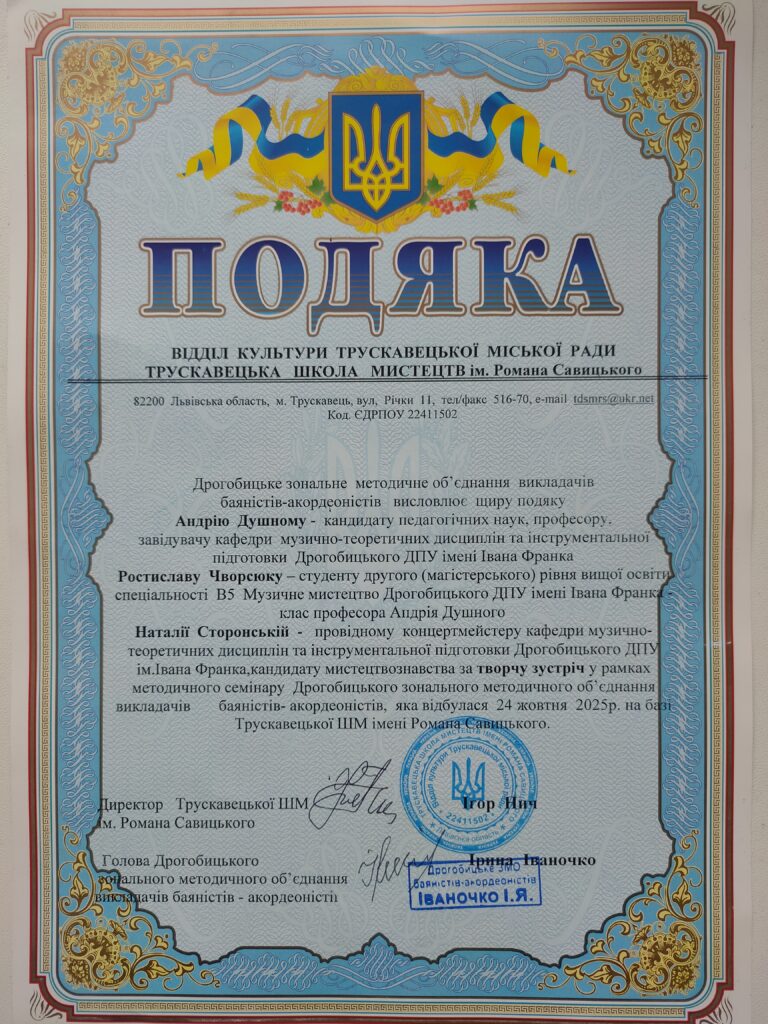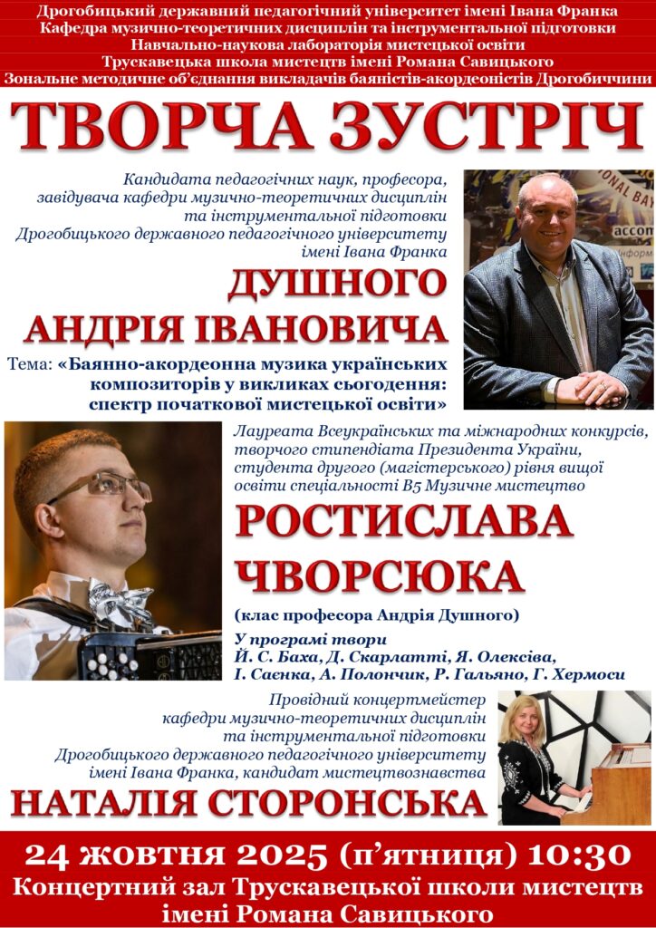 24 жовтня цього року на базі Трускавецької школи мистецтв імені Романа Савицького відбулася творча зустріч Дрогобицького зонального методичного об’єднання викладачів баяна-акордеона (голова – Ірина Іваночко) із завідувачем кафедри музично-теоретичних дисциплін та інструментальної підготовки, професором Андрієм Душний, студентом магістратури спеціальності В5 Музичне мистецтво, творчим стипендіатом Президента України Ростиславом Чворсюком й провідним концертмейстером кафедри, кандидатом мистецтвознавства Наталею Сторонською.