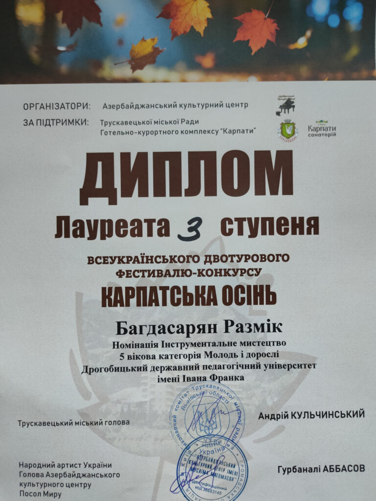 Лауреат 3 ступеня – Размік Багдасарян (клас доцента Валерія Шафети).