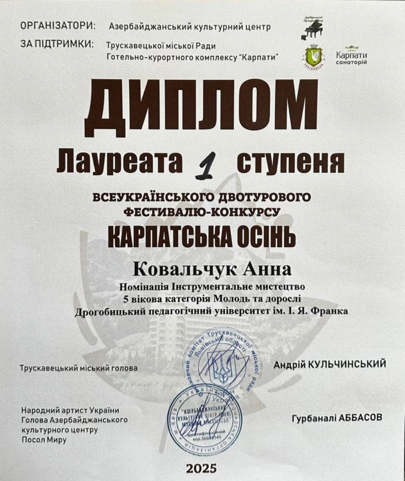 Лауреат 1 ступеня – Анна Ковальчук (клас доцента Уляни Молчко).