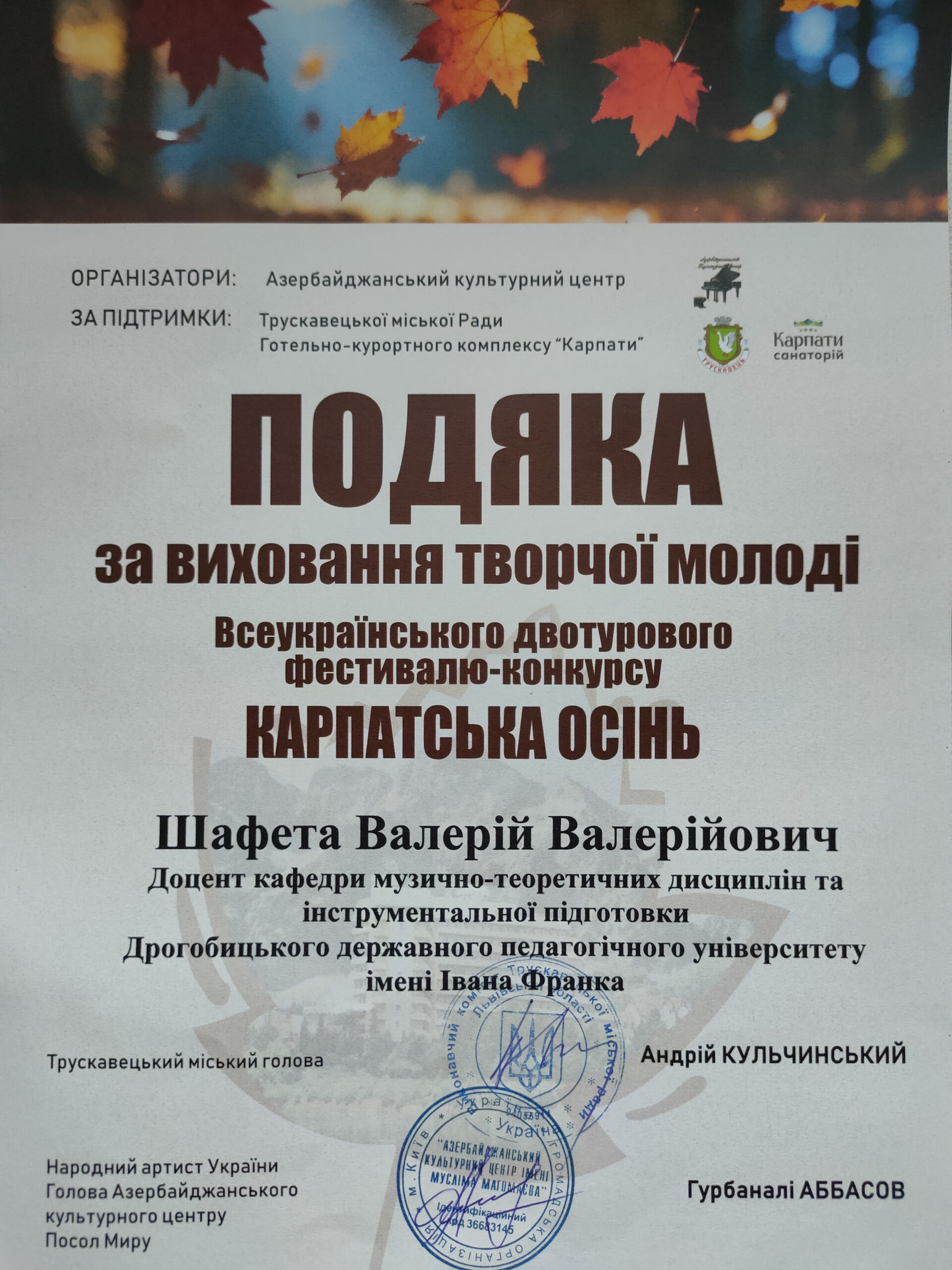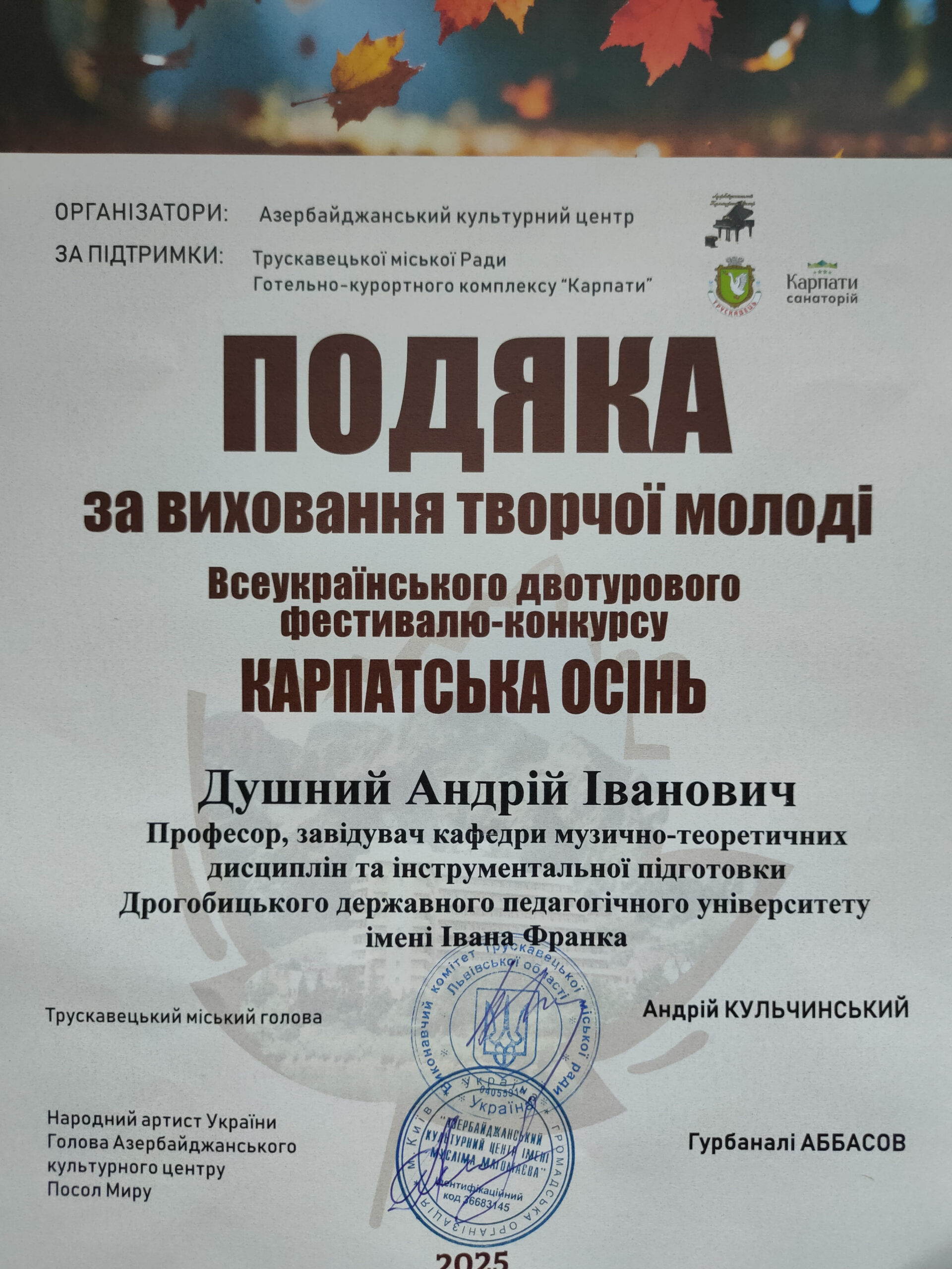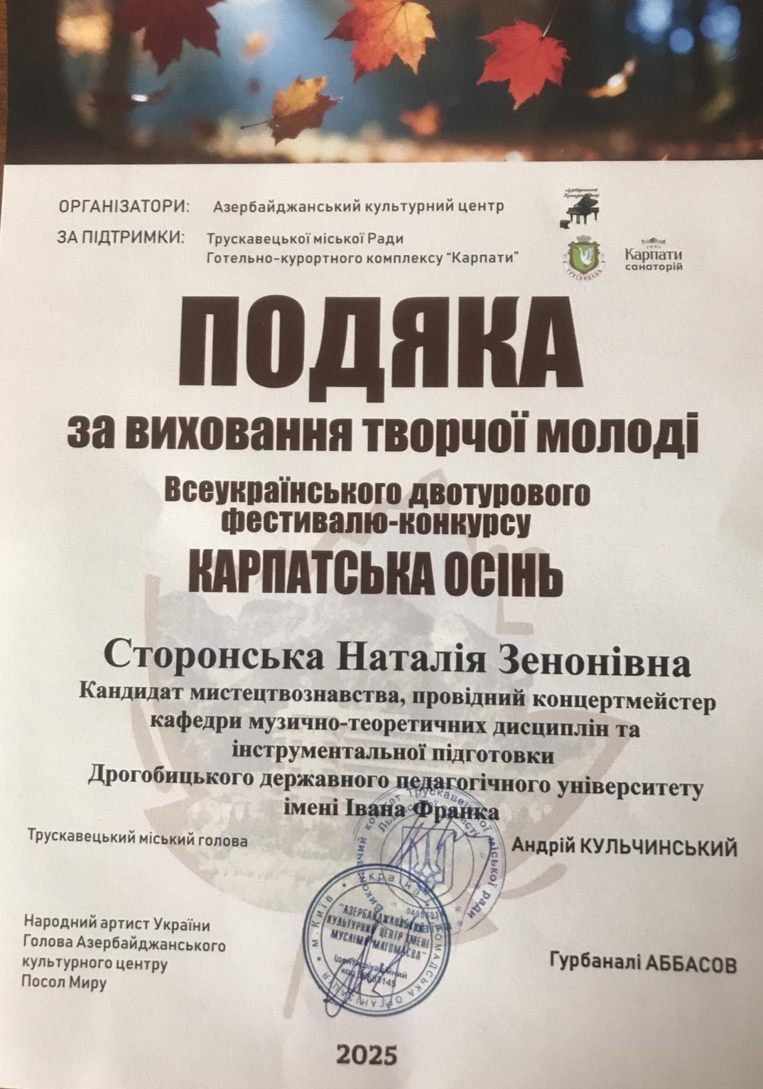 Наступного дня – 25 жовтня, у санаторії «Карпати» відбувся Всеукраїнський двотуровий фестиваль-конкурс мистецтв «КАРПАТСЬКА ОСІНЬ». Мистецька подія проводиться із ініціативи Азербайджанського культурного центру, Трускавецької міської ради та Готельно-курортного комплексу «Карпати». Організатором та ідейним натхненником фестивалю виступила Наталія Кудряшова.