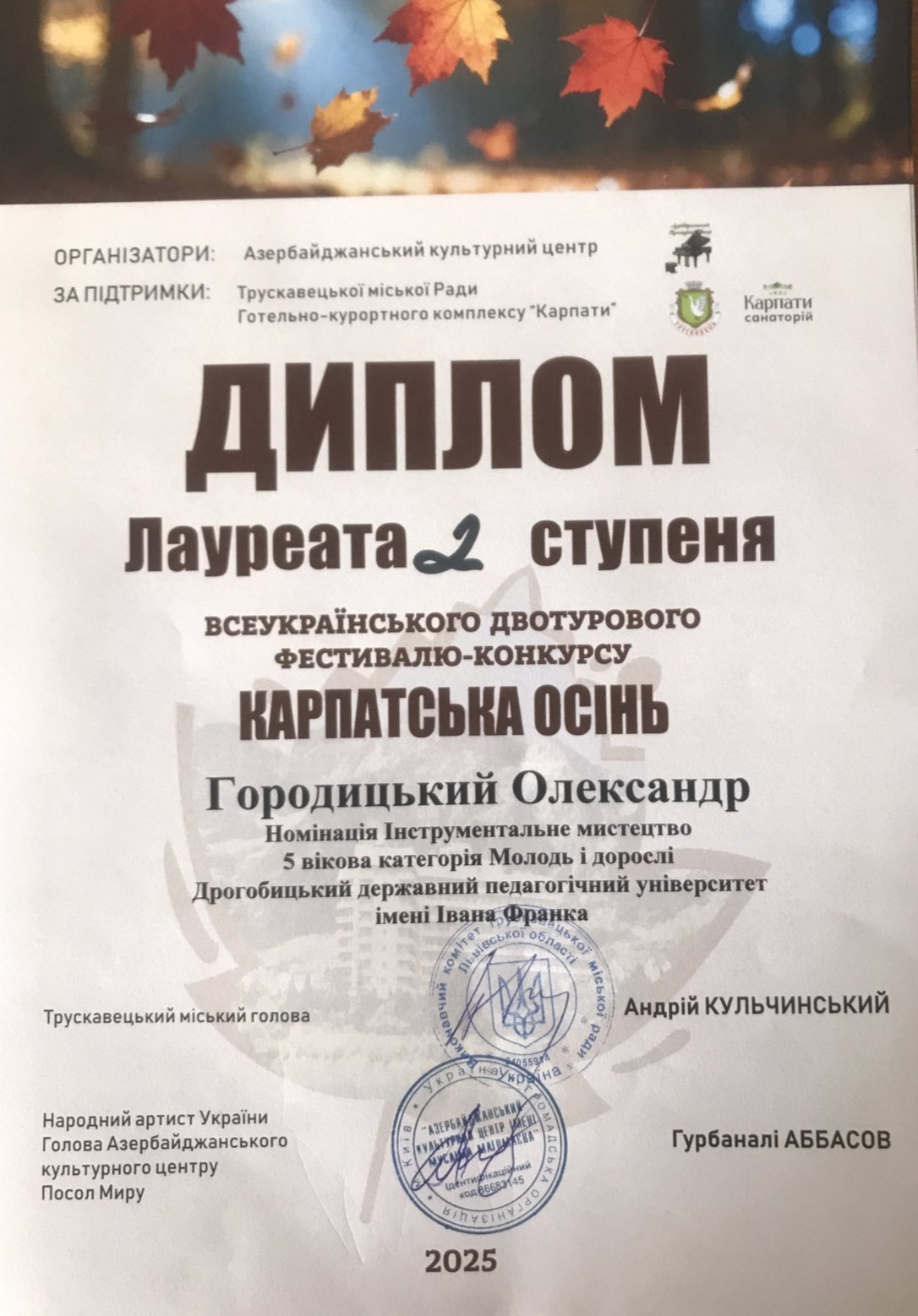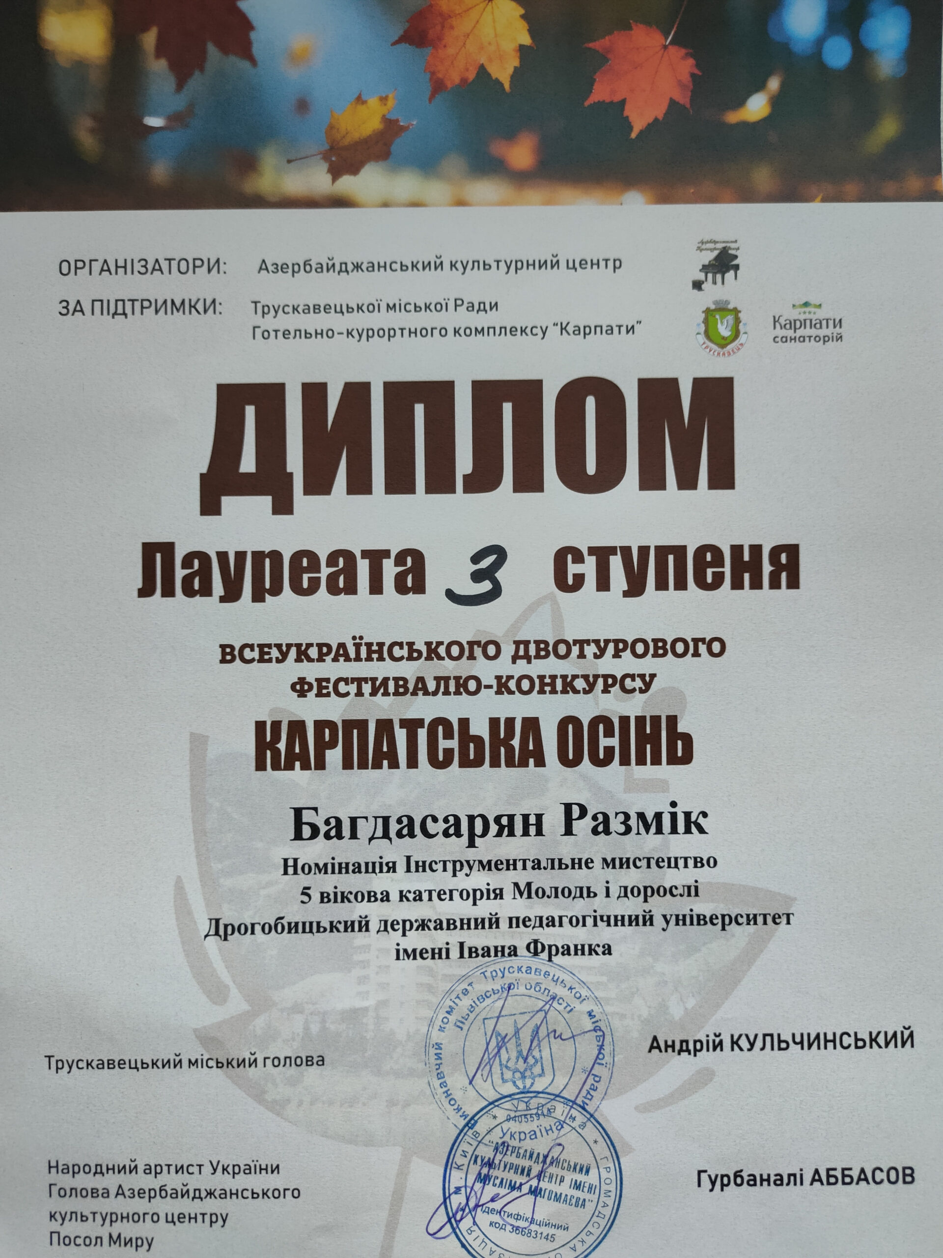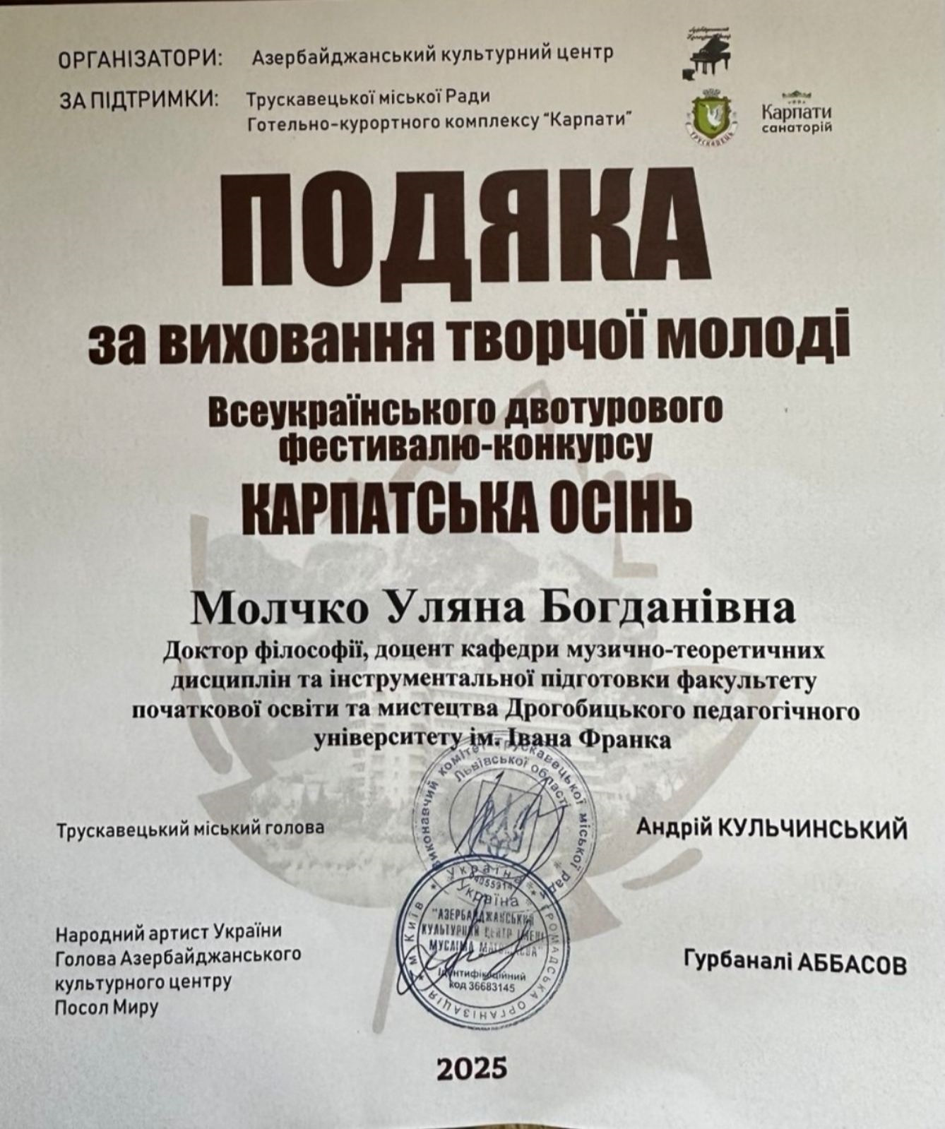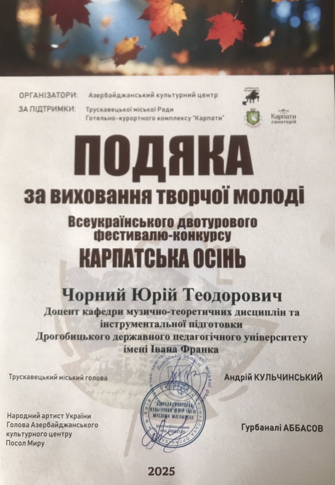 Наступного дня – 25 жовтня, у санаторії «Карпати» відбувся Всеукраїнський двотуровий фестиваль-конкурс мистецтв «КАРПАТСЬКА ОСІНЬ». Мистецька подія проводиться із ініціативи Азербайджанського культурного центру, Трускавецької міської ради та Готельно-курортного комплексу «Карпати». Організатором та ідейним натхненником фестивалю виступила Наталія Кудряшова.