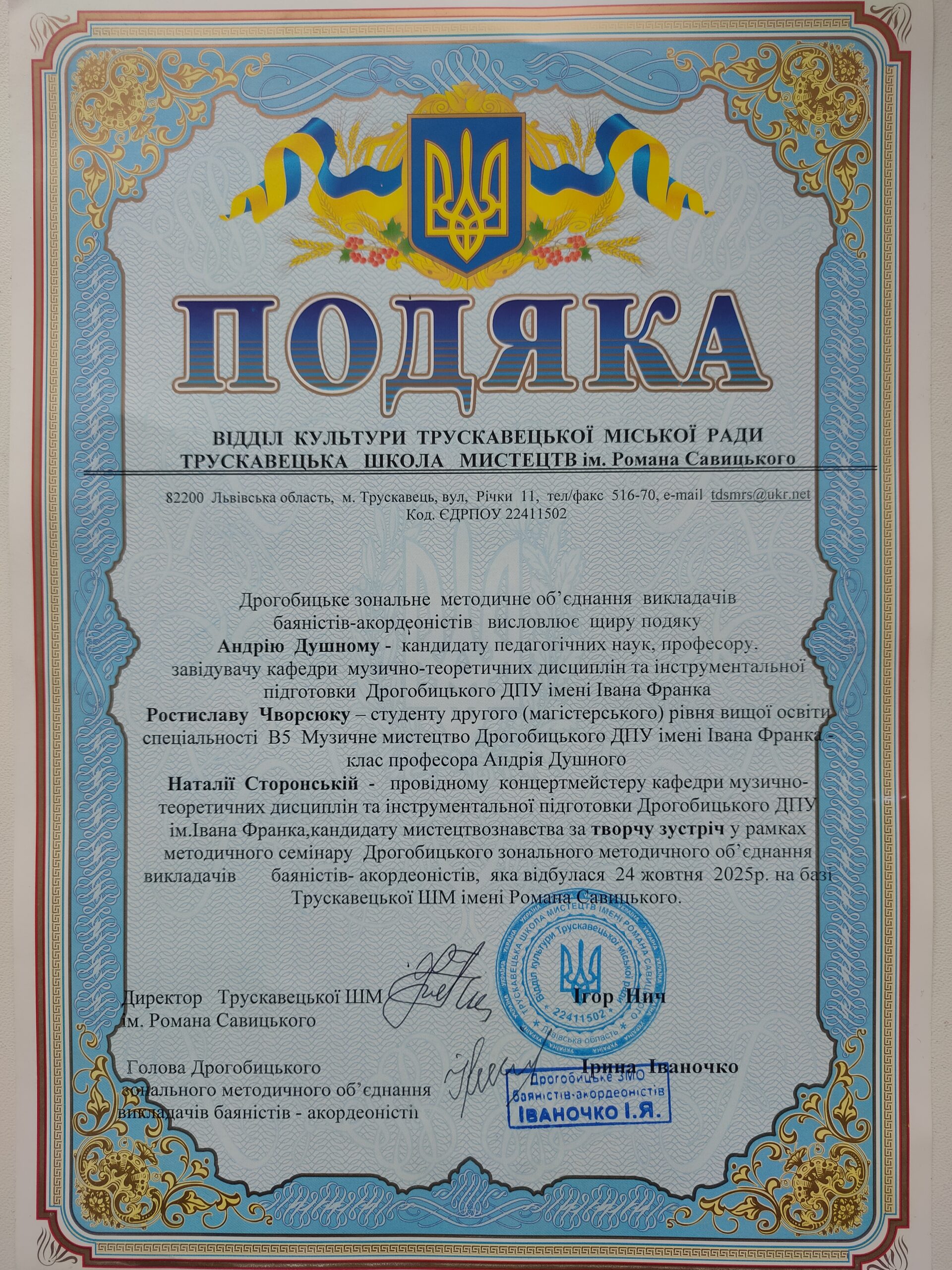 24 жовтня цього року на базі Трускавецької школи мистецтв імені Романа Савицького відбулася творча зустріч Дрогобицького зонального методичного об’єднання викладачів баяна-акордеона (голова – Ірина Іваночко) із завідувачем кафедри музично-теоретичних дисциплін та інструментальної підготовки, професором Андрієм Душний, студентом магістратури спеціальності В5 Музичне мистецтво, творчим стипендіатом Президента України Ростиславом Чворсюком й провідним концертмейстером кафедри, кандидатом мистецтвознавства Наталею Сторонською.
