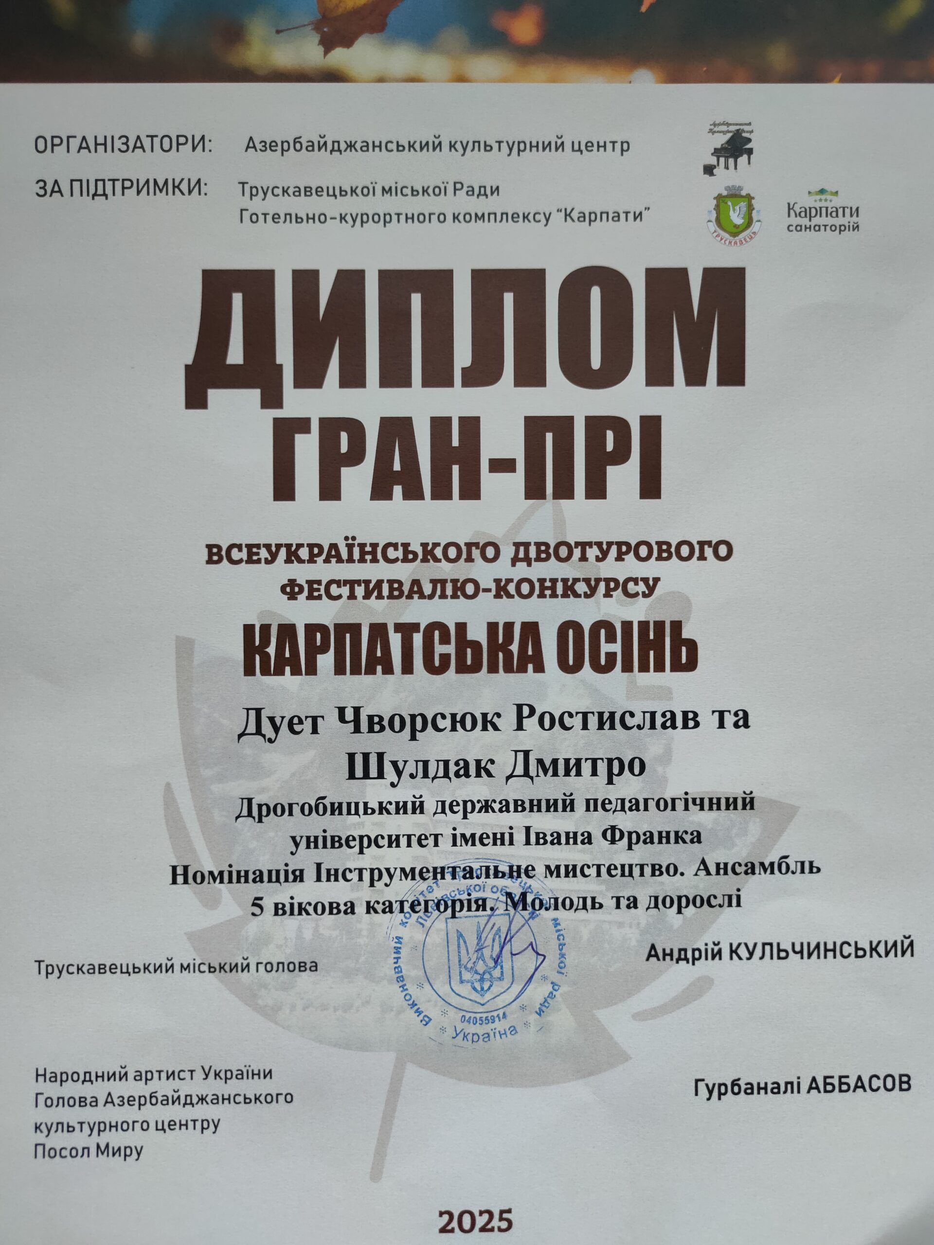 ГРАН-ПРІ – дует: Ростислав Чворсюк та Дмитро Шулдак (творчий керівник – професор Андрій Душний).