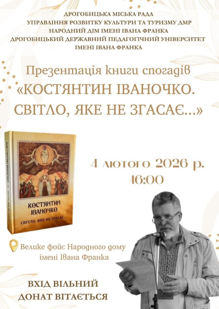 У фойє Народного дому імені Івана Франка 4 лютого о 16.00 відбудеться презентація книги спогадів «Костянтин Іваночко. Світло, яке не згасає…».