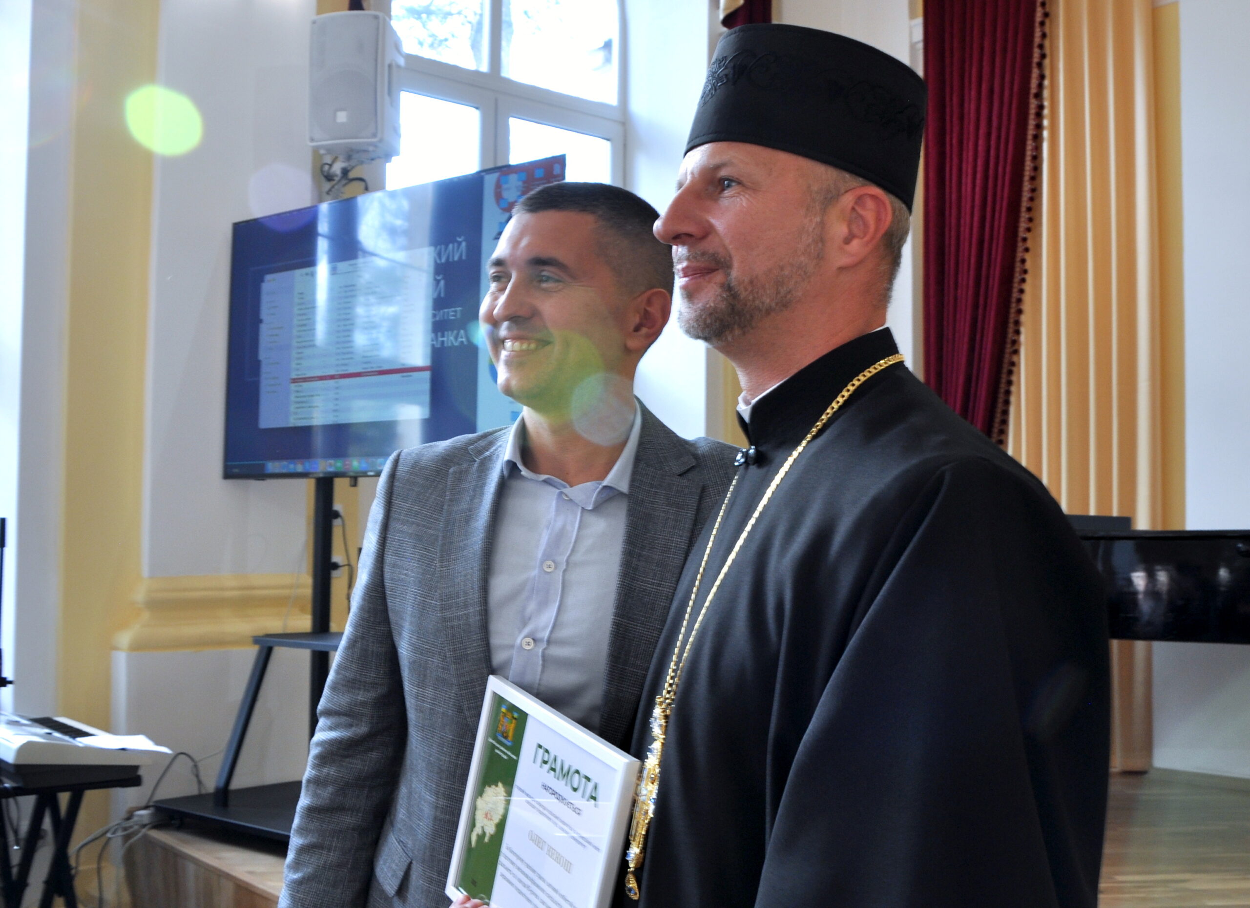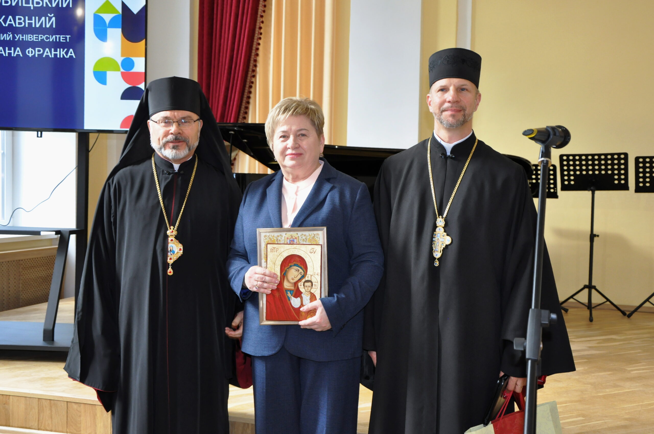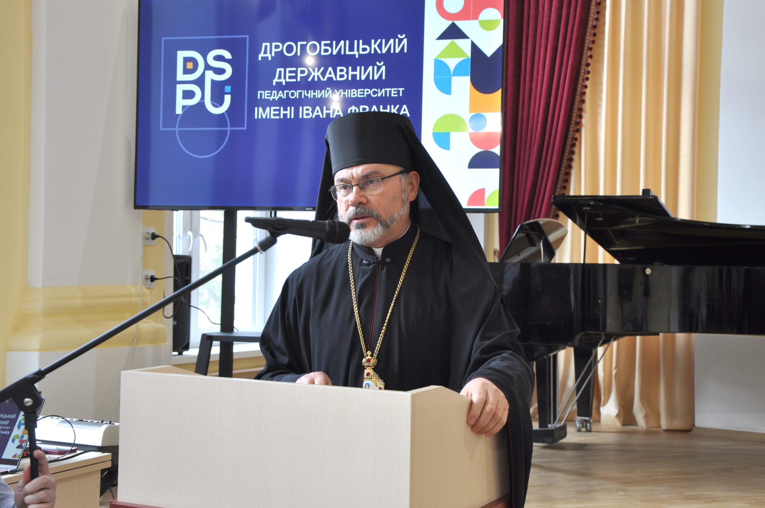До слова було запрошено Преосвященного владику Ярослава Приріза, який виголосив вітальну промову: «Університет відзначає не просто знакову річницю, а славетний шлях розвитку, досягнень і безцінний внесок у вищу освіту України. Це також чудова нагода не лише згадати численні наукові здобутки, цілу плеяду видатних викладачів, випускників, діячів мистецтва і науки, а й окреслити сміливі плани на майбутнє. Ваш університет є не просто науково-педагогічною інституцією, він виконує важливу національно-культурну та громадсько-виховну місію. У нинішніх непростих суспільно-політичних умовах, коли Українська держава утверджується у важкій боротьбі з російським агресором, ми покликані особливо зосередити увагу на важливості духовних підвалин у житті нашої країни», – наголосив правлячий архиєрей Самбірсько-Дрогобицької єпархії УГКЦ.