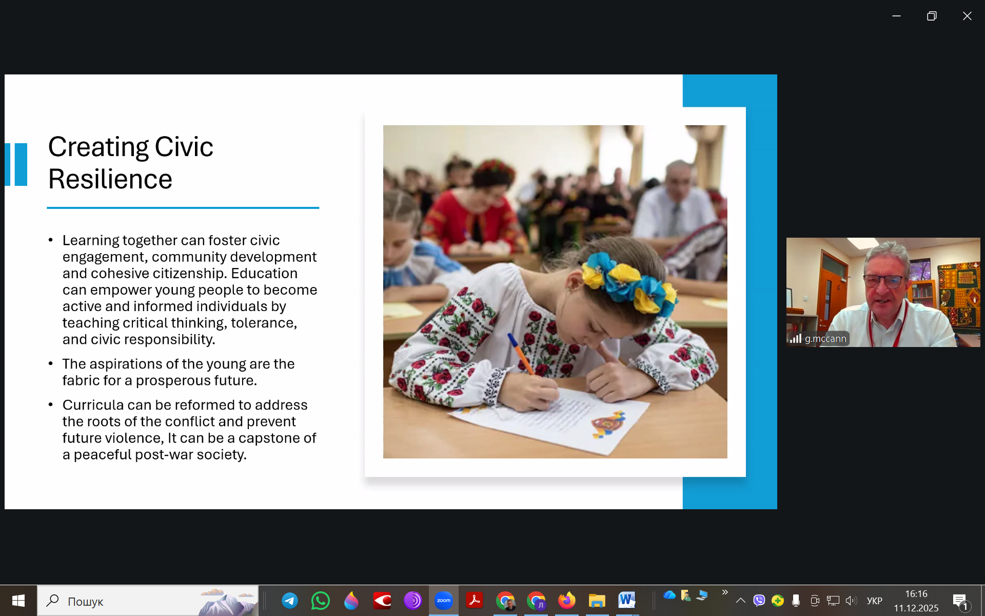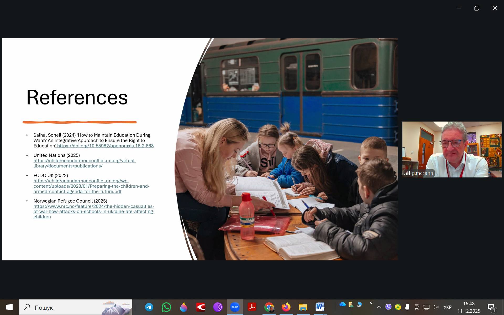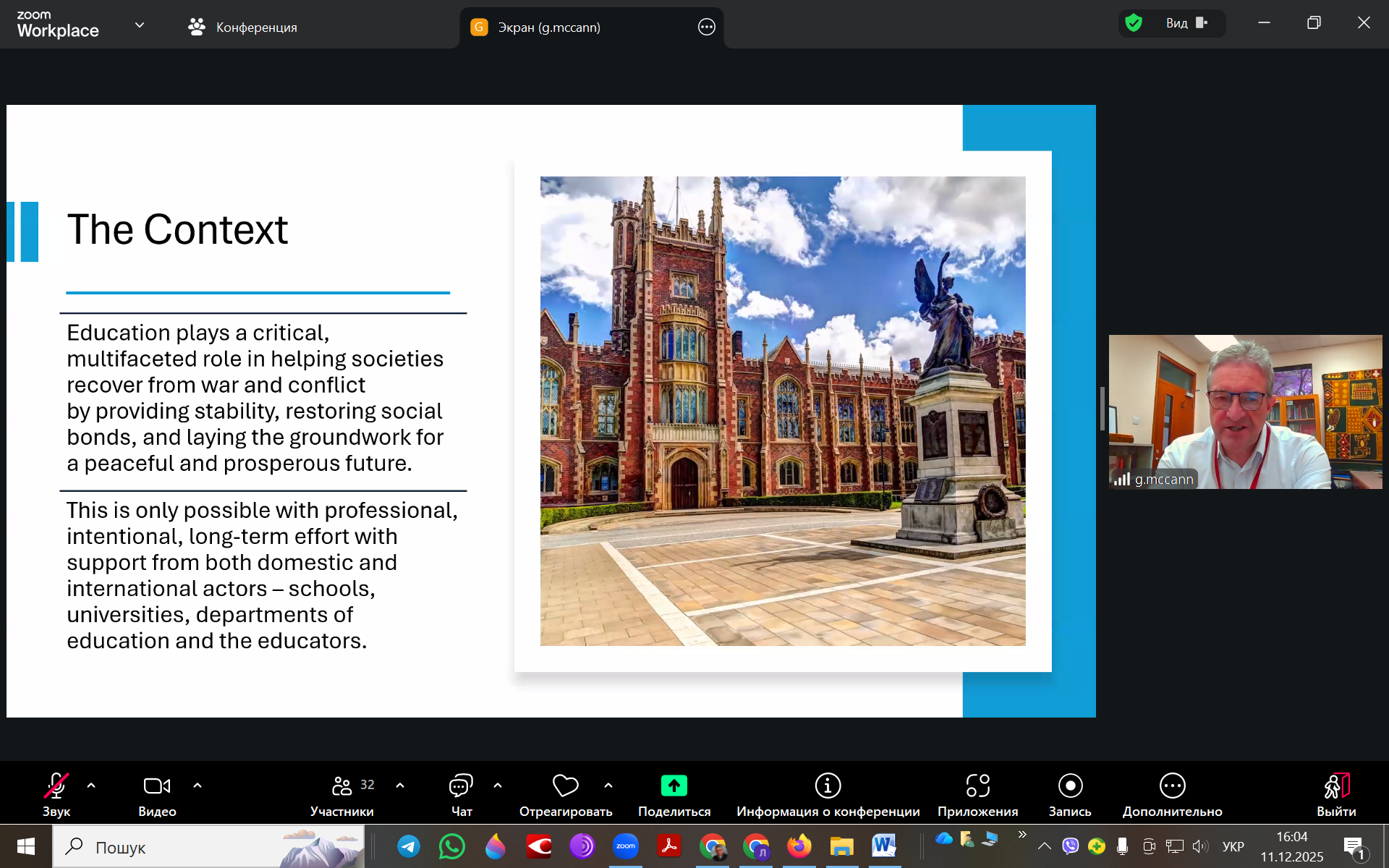 Аспіранти та викладачі кафедри технологічної та професійної освіти 11 грудня взяли участь у відкритій лекції професора Джерарда МакКанна з Квінс університету в Белфасті (Queen’s University Belfast) на тему «Освіта для відновлення». Основна ідея лекції полягала в тому, що освіта відіграє багатогранну та стратегічно важливу роль у підтримці суспільств, які зазнали війни та конфліктів, а також сприяє стабілізації, відновленню соціальних зв’язків і формуванню основ для мирного та сталого розвитку.