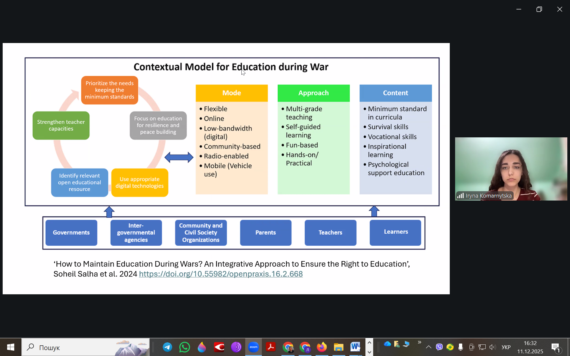 Особливу увагу професор приділив характеристиці контекстуальної моделі освіти в умовах війни, яка дозволяє адаптувати навчальні програми до кризових обставин. Він навів приклади інтеграції психологічної підтримки, соціального навчання та проєктної діяльності, що сприяє не лише засвоєнню знань, а й відновленню відчуття безпеки, соціальної належності та впевненості у власних можливостях у студентів. Акцент було зроблено на розвитку лідерських компетентностей, навичок співпраці та творчого вирішення проблем у складних соціально-політичних умовах.