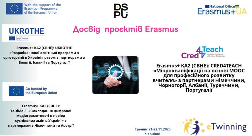 21–22 листопада у Чернівцях відбувся тренінг «Співпраця університетів і шкіл у міжнародних проєктах Програми ЄС Еразмус+ задля вдосконалення підготовки вчителів: eTwinning та СВНЕ» (модератори: координаторка національного офісу підтримки eTwinning Світлана Калашнікова, координаторка національного офісу Еразмус+ Світлана Шитікова).
