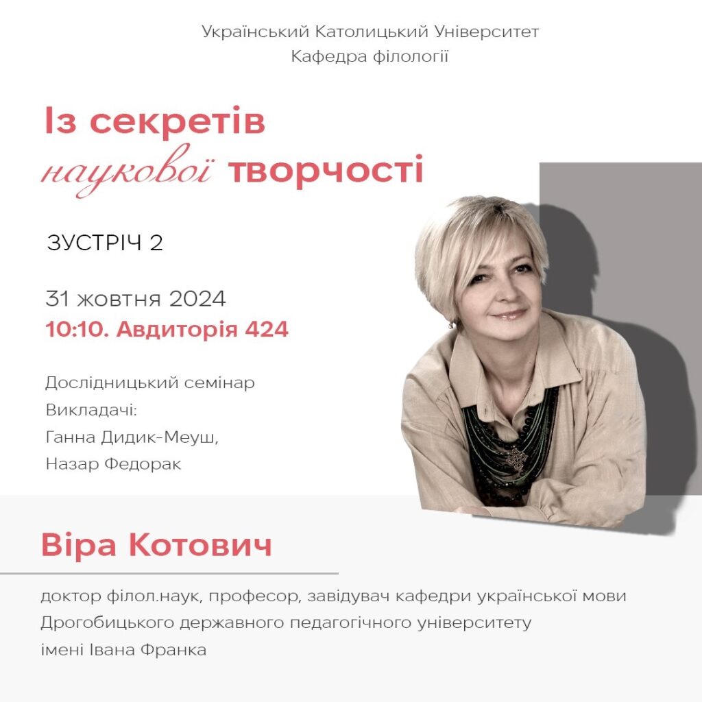 «Із секретів наукової творчості» – таку назву мала наукова зустріч, яка відбулася 31 жовтня в Українському Католицькому Університеті. Її провела завідувачка кафедри української мови ДДПУ ім. І. Франка проф. Віра Котович на запрошення професорки кафедри філології УКУ Ганни Дидик-Меуш.