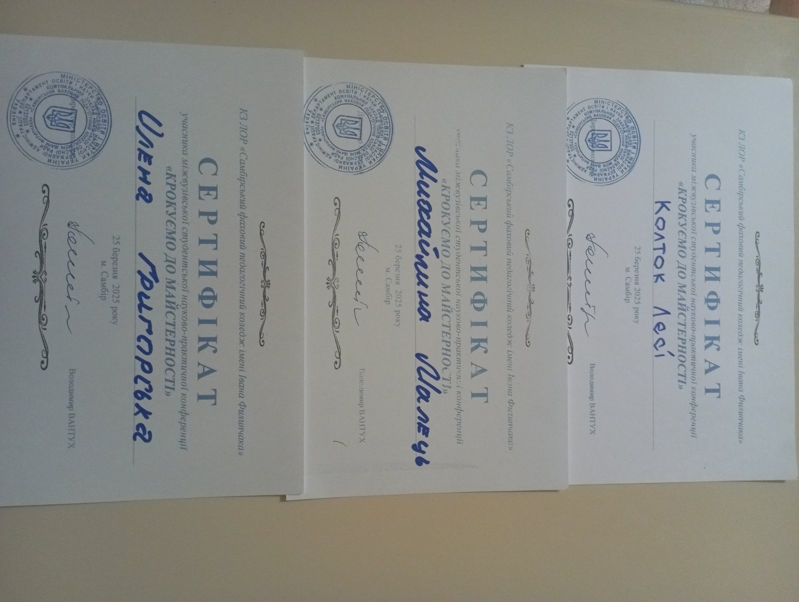 25 березня студенти спеціальності Початкова освіта Михайлина Малець (наукова керівниця доцентка Леся Колток) та Олена Григорська (наукова керівниця доцентка Оксана Жигайло) взяли участь у міжвузівській студентській науково-практичній конференції «Крокуємо до майстерності», організованій КЗ ЛОР «Самбірський фаховий педагогічний коледж імені Івана Филипчака, та виступили із цікавими, змістовними та актуальними доповідями.
