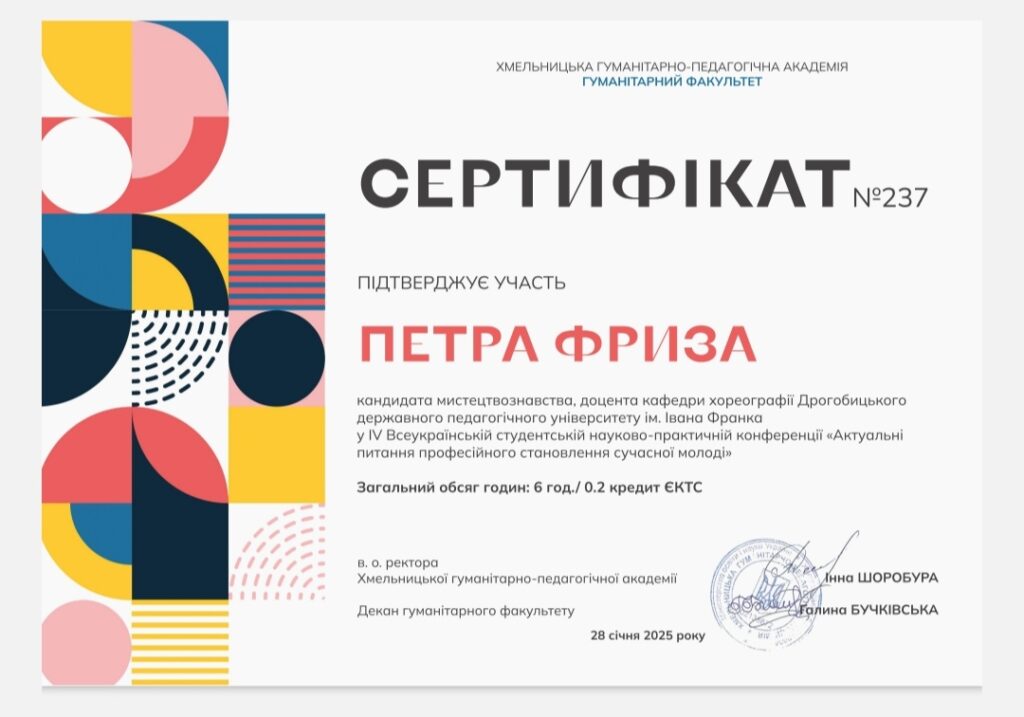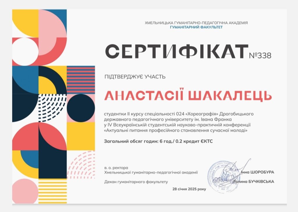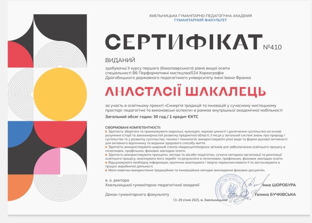 Протягом 13 – 29 січня здобувачка першого (бакалаврського) рівня вищої освіти спеціальності 024 Хореографія Дрогобицького державного педагогічного університету імені Івана Франка Анастасія Шакалець брала участь в освітньому проєкті від Хмельницької гуманітарно-педагогічної академії «Синергія традицій та інновацій у сучасному мистецькому просторі: педагогічні та виконавські аспекти», який спрямований на розвиток академічної мобільності та співпраці між університетами, а також на підвищення рівня викладання мистецьких дисциплін.