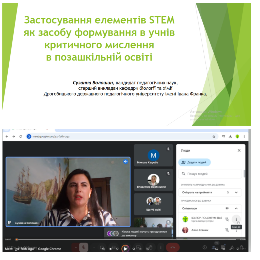 Сузанна Волошин поділилася досвідом роботи з проблеми застосування елементів STEM-освіти як важливого засобу формування в учнів критичного мислення в позашкіллі, отриманого на заняттях гуртка «STEM-дослідники» позашкільного підрозділу Малої академії наук, яка функціонує на базі ліцею імені Богдана Лепкого Дрогобицької міської ради Львівської області.