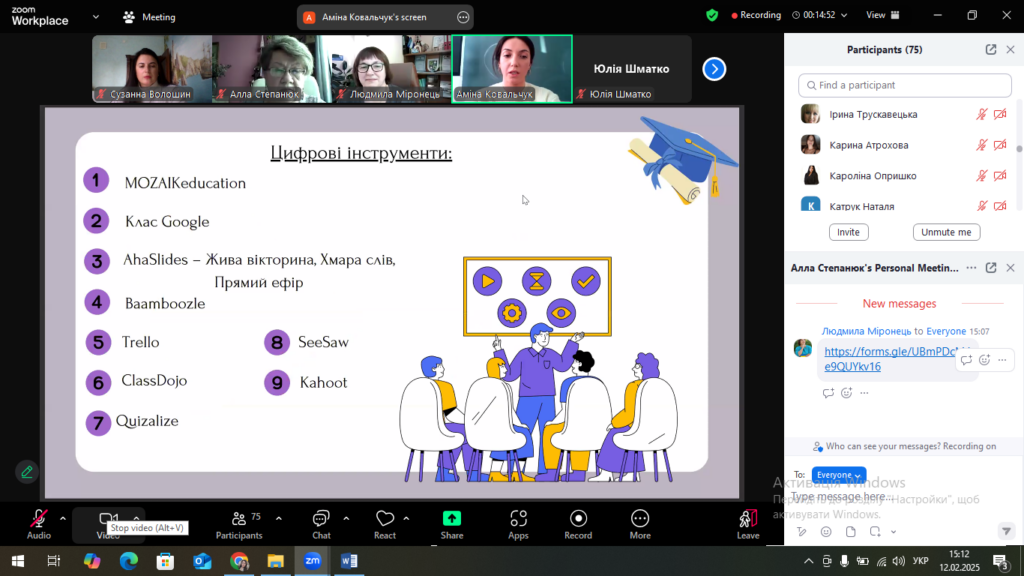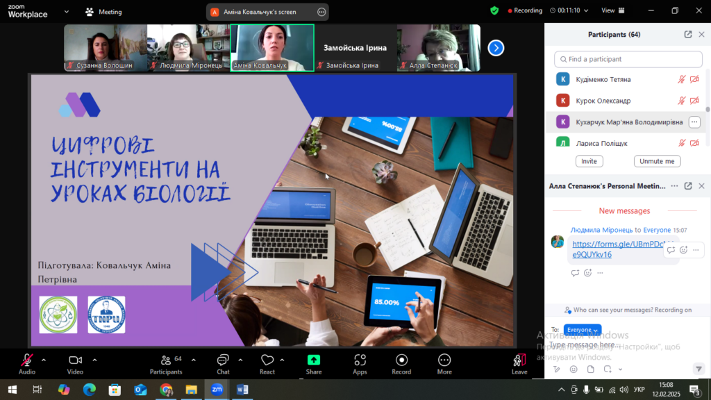 Колектив кафедри вдячний колегам ЗВО – модераторам Людмилі Міронець, Аллі Степанюк, Наталії Грицай, а також лектору Аміні Ковальчук – вчителю хімії, біології та інтегрованого курсу «Пізнаємо природу» Нижчелуб’янівського ліцею ЗМР за цікаві та змістовні ідеї щодо використання цифрових інструментів для проведення сучасних уроків з біології.
