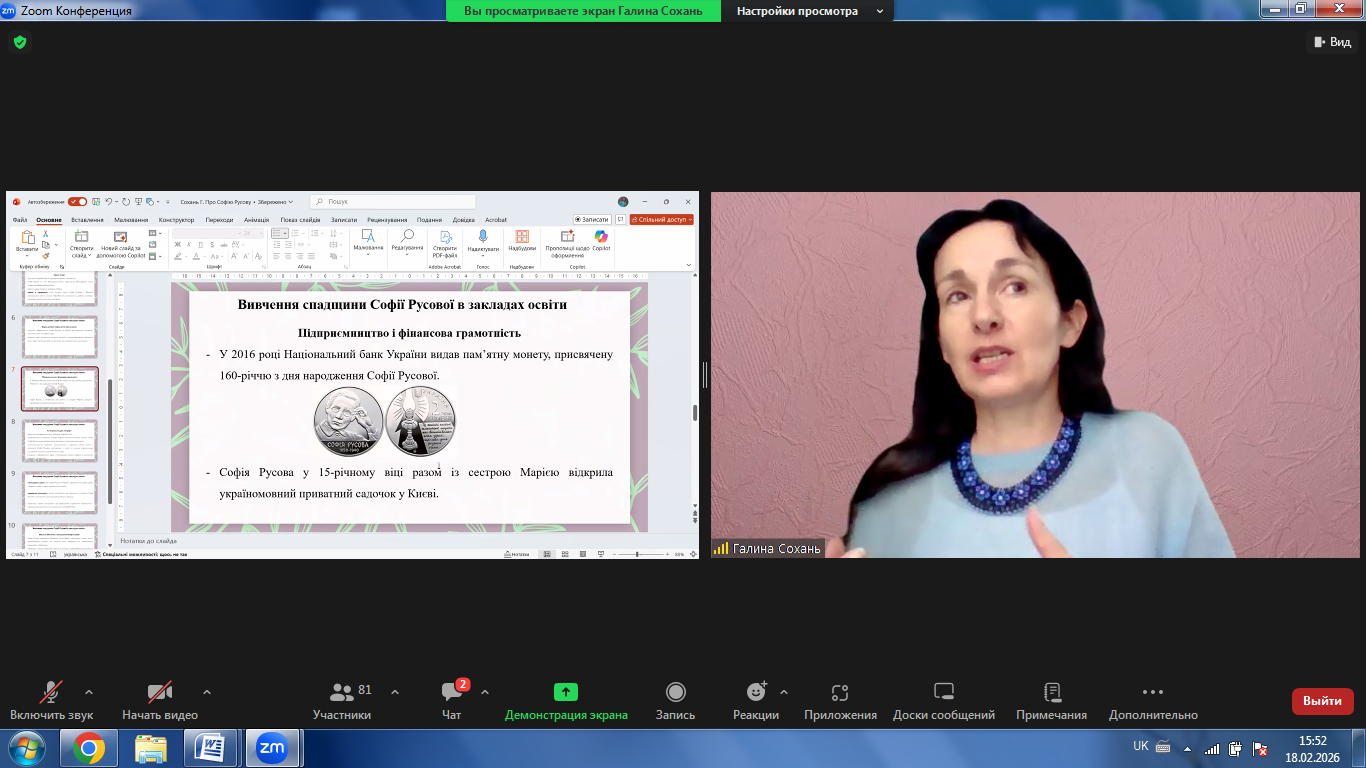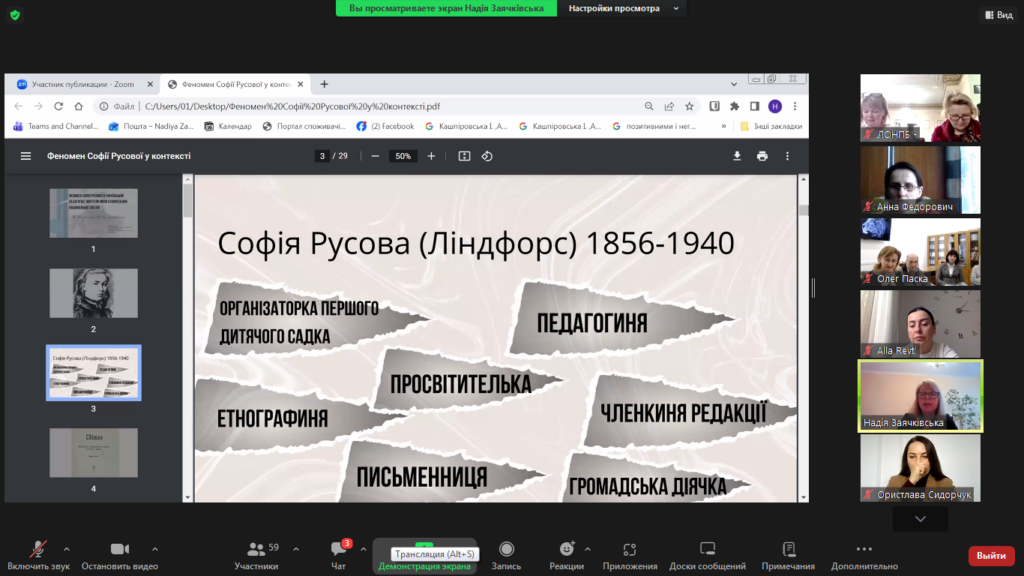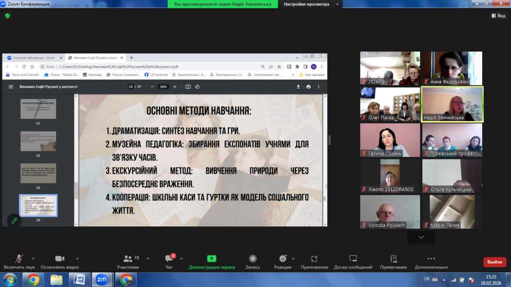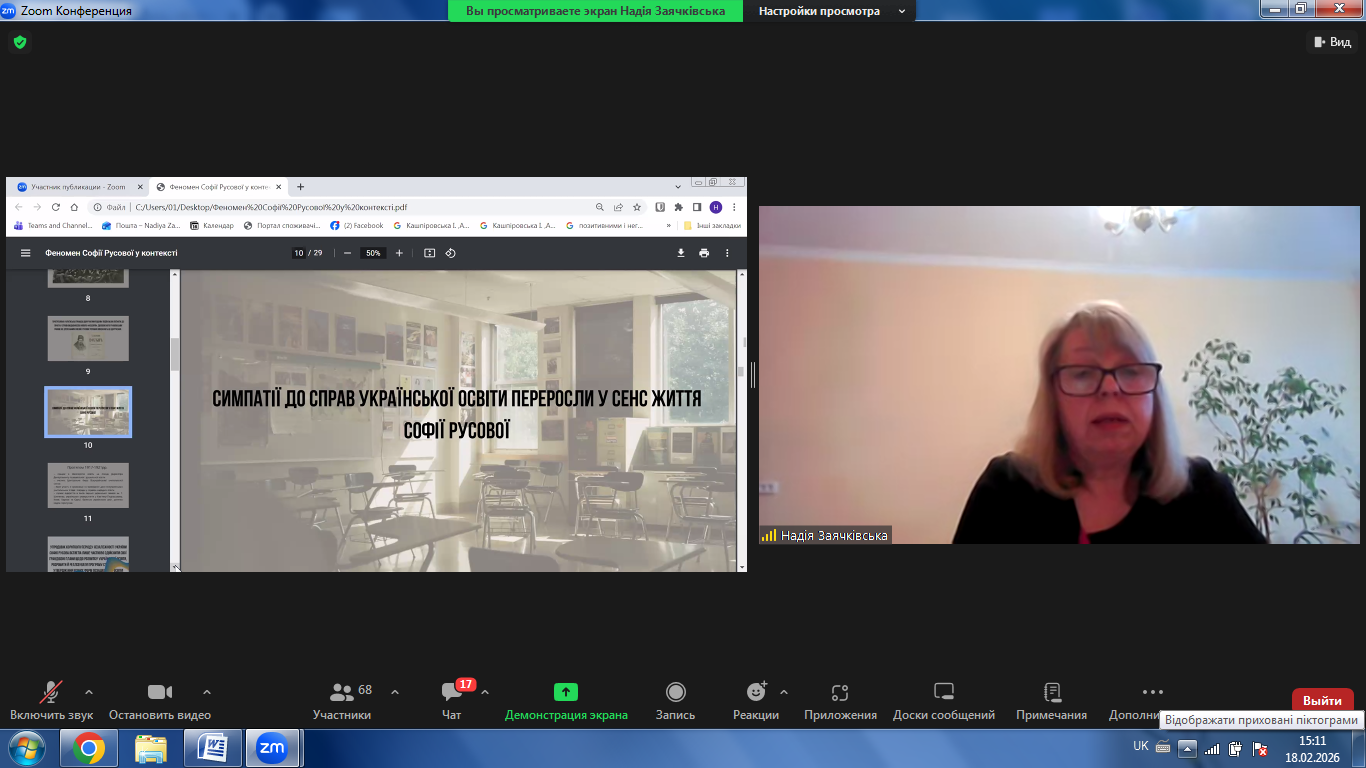 18 лютого викладачі кафедри загальної педагогіки та дошкільної освіти факультету історії, педагогіки та психології ДДПУ взяли участь в онлайн -зустрічі освітян Львівщини «Актуальні ідеї Софії Русової в ХХІ столітті». Круглий стіл, приурочений до 170-річчя від дня народження видатної української просвітниці, організував департамент освіти і науки ЛОДА.