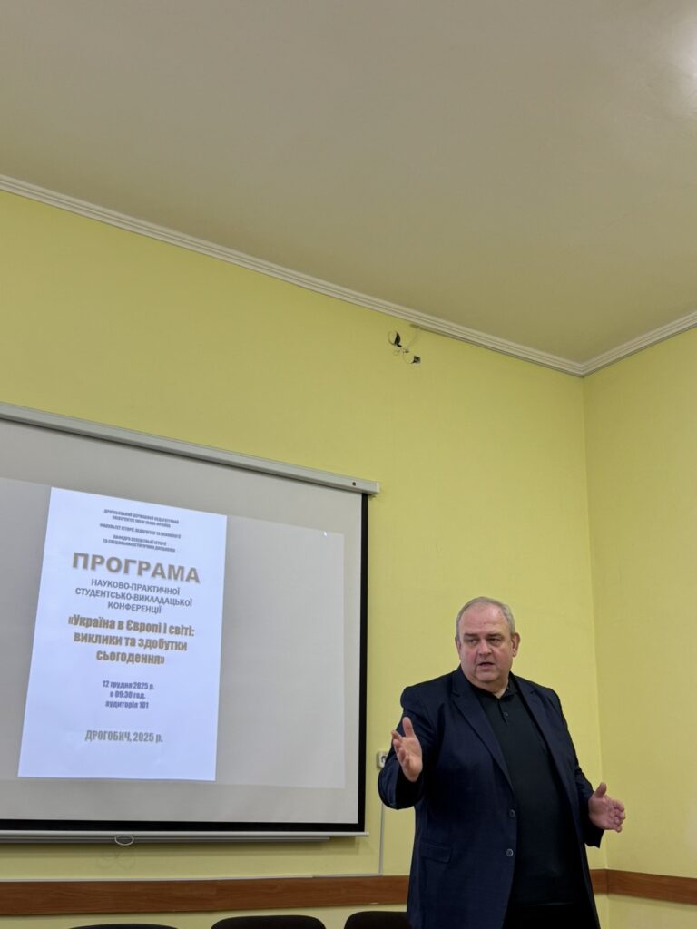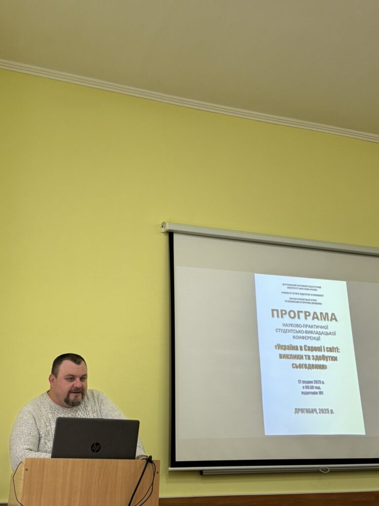 У стінах факультету історії, педагогіки та психології 12 грудня у межах вивчення загальноуніверситетської вибіркової дисципліни «Україна в Європі і світі» відбулася підсумкова науково-практична студентсько-викладацька конференція «Україна в Європі і світі: виклики та здобутки сьогодення». Організаторами заходу виступили деканат й викладачі кафедри всесвітньої історії та спеціальних історичних дисциплін, зокрема декан, доцент Орест Гук, заступники декана, доценти Володимир Галик і Андрій Зимянський, завідувач кафедри, професор Олег Петречко та доцентка Світлана Біла. Модерували захід доценти Володимир Галик і Світлана Біла.