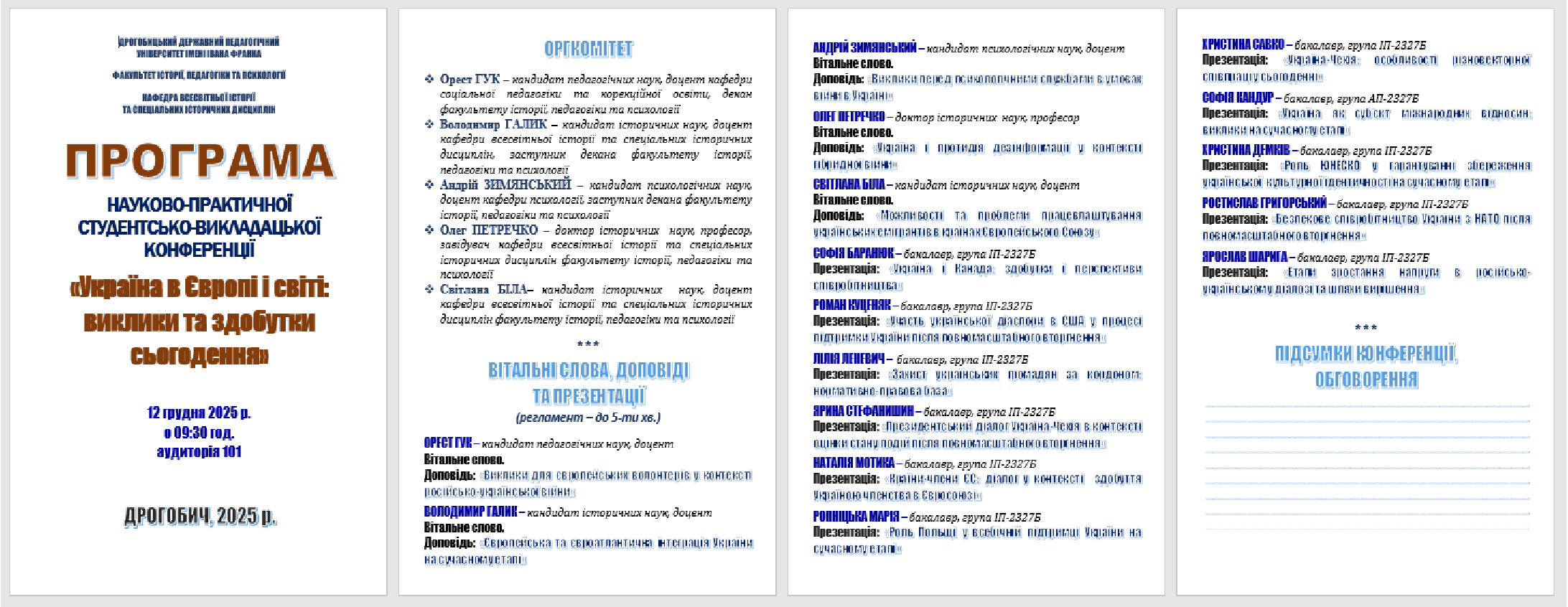 У стінах факультету історії, педагогіки та психології 12 грудня у межах вивчення загальноуніверситетської вибіркової дисципліни «Україна в Європі і світі» відбулася підсумкова науково-практична студентсько-викладацька конференція «Україна в Європі і світі: виклики та здобутки сьогодення». Організаторами заходу виступили деканат й викладачі кафедри всесвітньої історії та спеціальних історичних дисциплін, зокрема декан, доцент Орест Гук, заступники декана, доценти Володимир Галик і Андрій Зимянський, завідувач кафедри, професор Олег Петречко та доцентка Світлана Біла. Модерували захід доценти Володимир Галик і Світлана Біла.