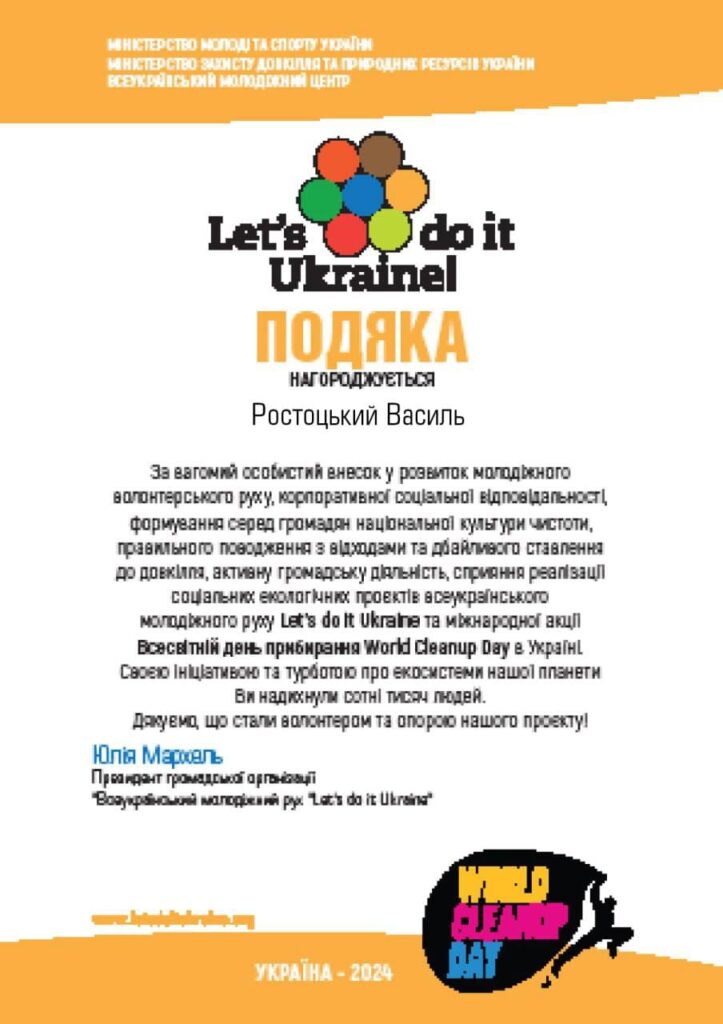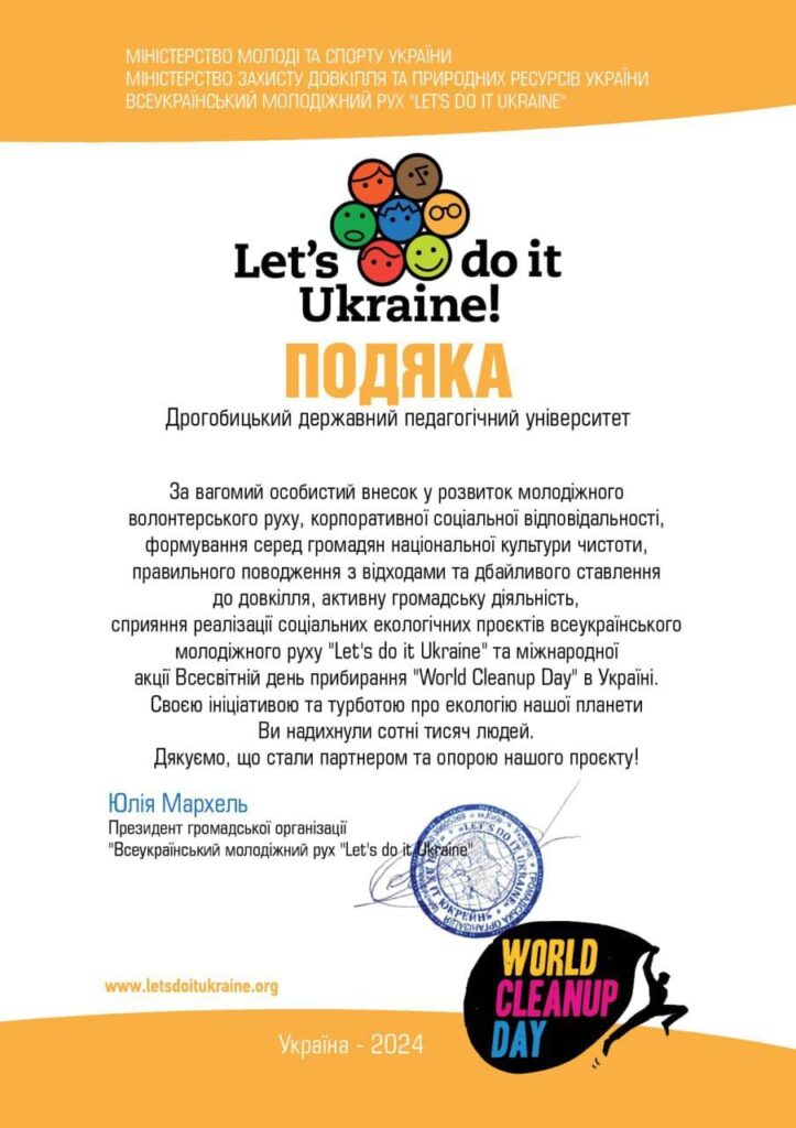 За активну участь у цій екологічній ініціативі ДДПУ та студент університету Василь Ростоцький отримали подяку від української екоактивістка та засновниці Всеукраїнського молодіжного руху Let’s do it, Ukraine , координаторки Всесвітнього дня прибирання в Україні Юлії Мархель. Її команда невтомно працює над тим, щоб надихнути мільйони людей на відповідальне ставлення до навколишнього середовища та зміни, які починаються з кожного з нас.