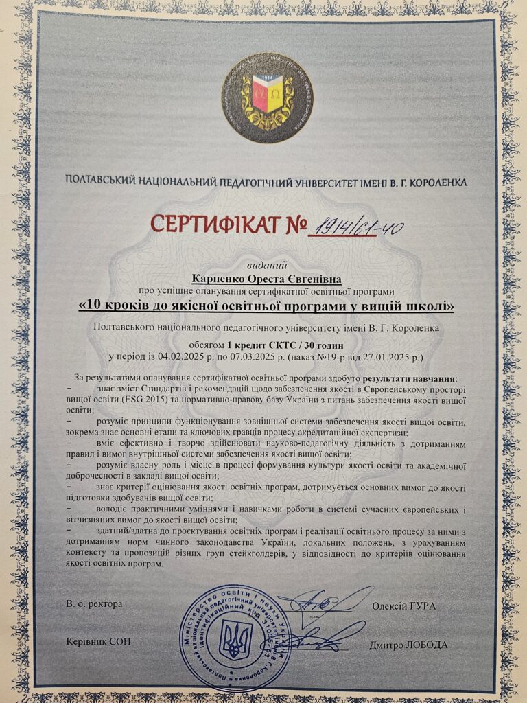 З 4 лютого по 7 березня 2025 року професорка кафедри загальної педагогіки та дошкільної освіти університету Ореста Карпенко взяла участь у навчанні за сертифікатною освітньою програмою «10 кроків до якісної освітньої програми у вищій школі», що проходила на базі Полтавського національного педагогічного університету імені В.Г. Короленка.