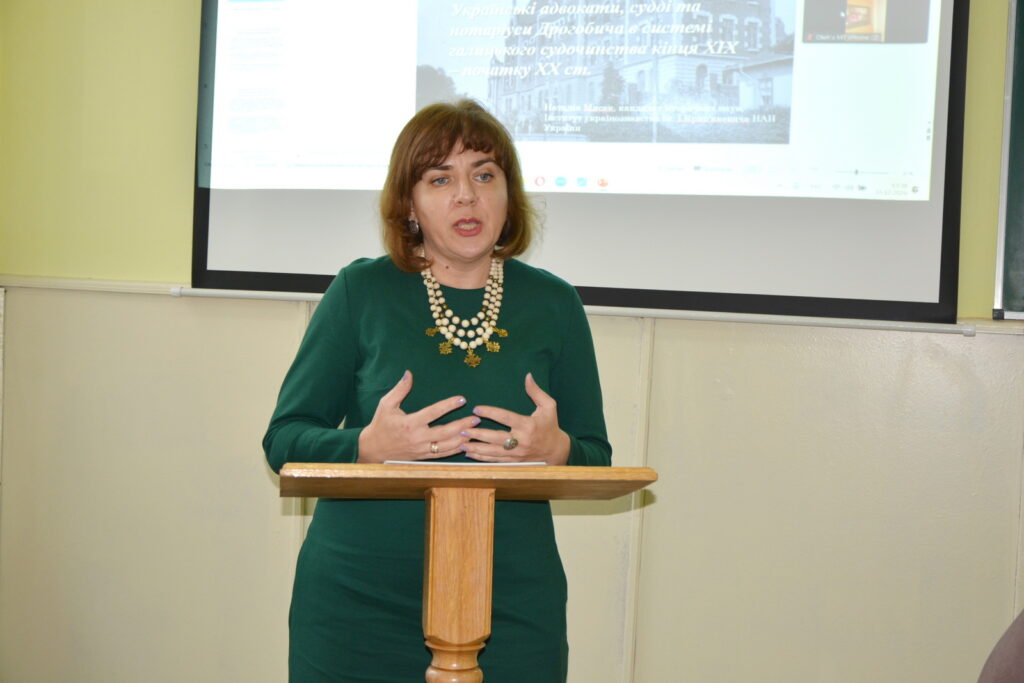 -За масивом матеріалу з історії адвокатури саме Львівщина і Галичина є найбільш потужними: тут колиска української адвокатури кінця ХIХ – початку ХХ століття. Саме тут зароджувалася адвокатська еліта, лідери українського руху, які гонорарами з адвокатській діяльності фінансували українські культурні ініціативи, підтримуючи розвиток наукового товариства ім. Тараса Шевченка, «Просвіту». Ми маємоу цій аудиторії стенд «Меценати-адвокати», де міститься інформація про адвоката Івана Чернявського з Коломиї, першого засновника української філателії; адвоката з Ніжина Олександр Кониського, автора «духовного гімну» «Боже великий, єдиний, нам Україну храни», який віддав морги поля для Наукового товариства імені Тараса Шевченка; про Теофіла Окуневського, Іллю Шрага, відомого політика, який був членом Української Центральної Ради; про Костю Левицького, який був головою української франкції в австрійському парламенті і галицькому крайовому сеймі. Саме на межі ХIХ- ХХ століть діяли і ставали лідерами національного руху Євген Петрушевич, Володимир Ільницький, Антін Горбачевський, який був делеґатом Національної Ради ЗУНР, повітовим комісаром на Дрогобиччині, – розповіла Ірина Василик.