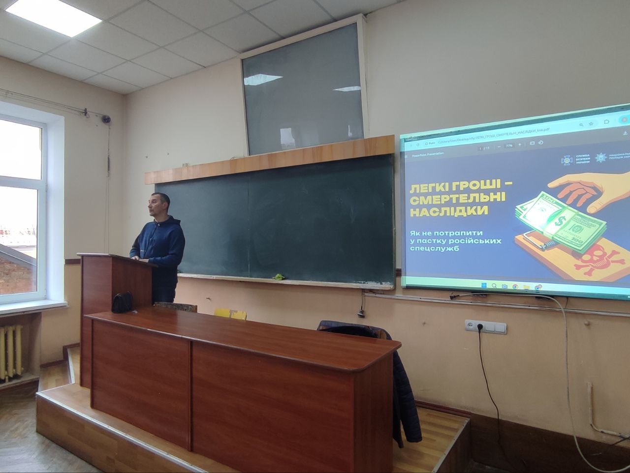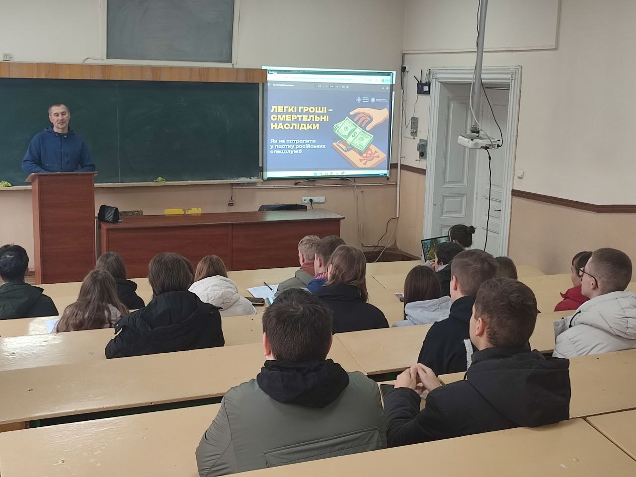 У межах заходу студенти переглянули тематичний відеоматеріал, підготовлений фахівцями СБУ, у якому розкрито механізми вербування молоді російськими спецслужбами, зокрема через інтернет та соціальні мережі, із використанням маніпуляцій і обіцянок швидкого та легкого заробітку.