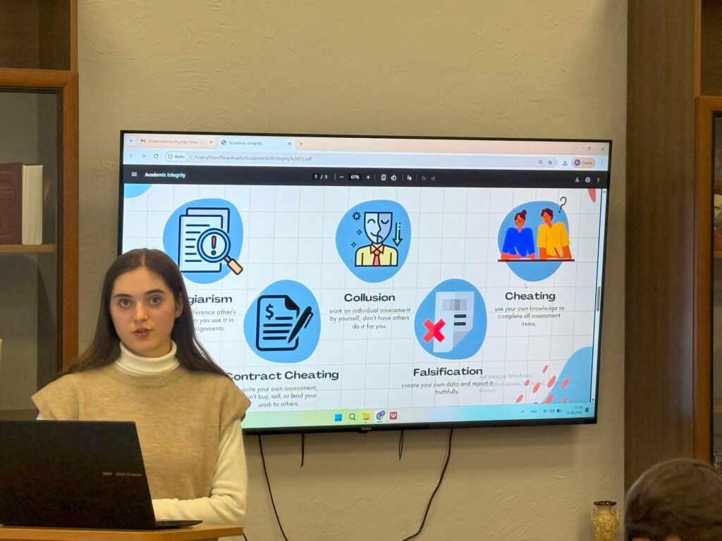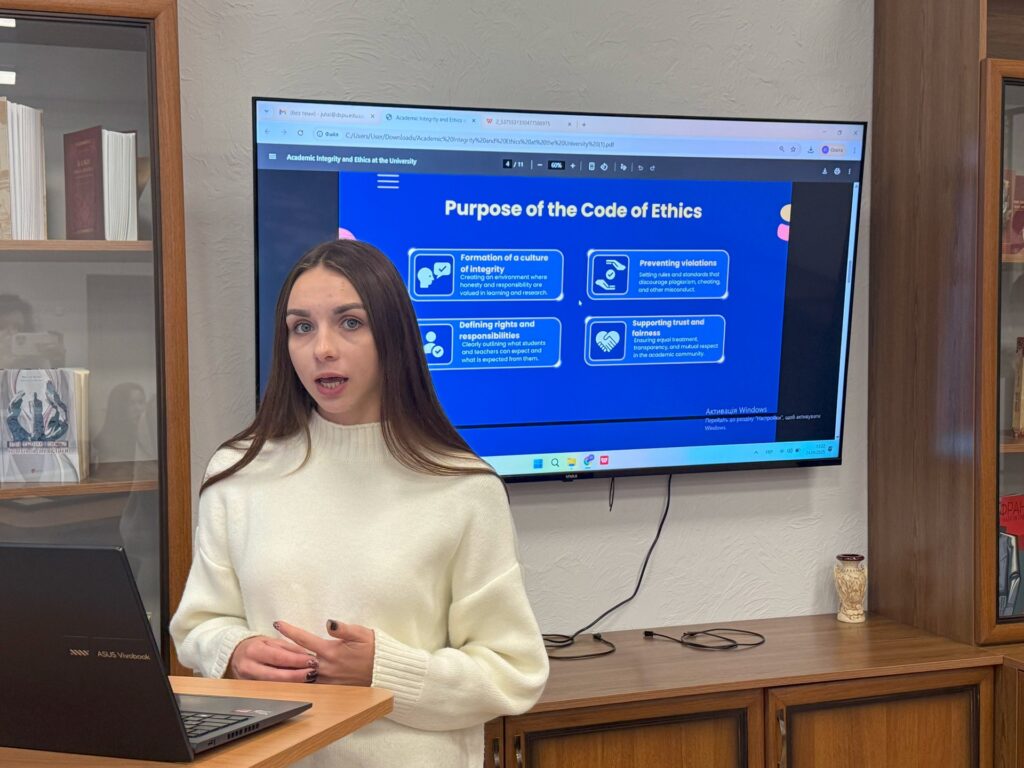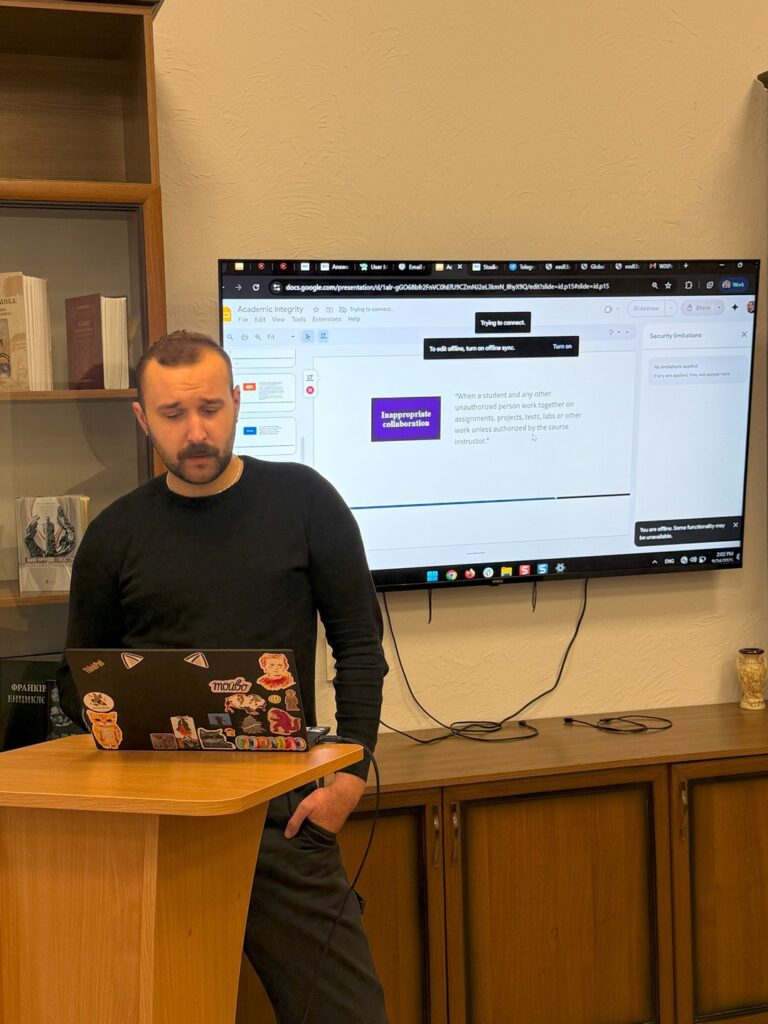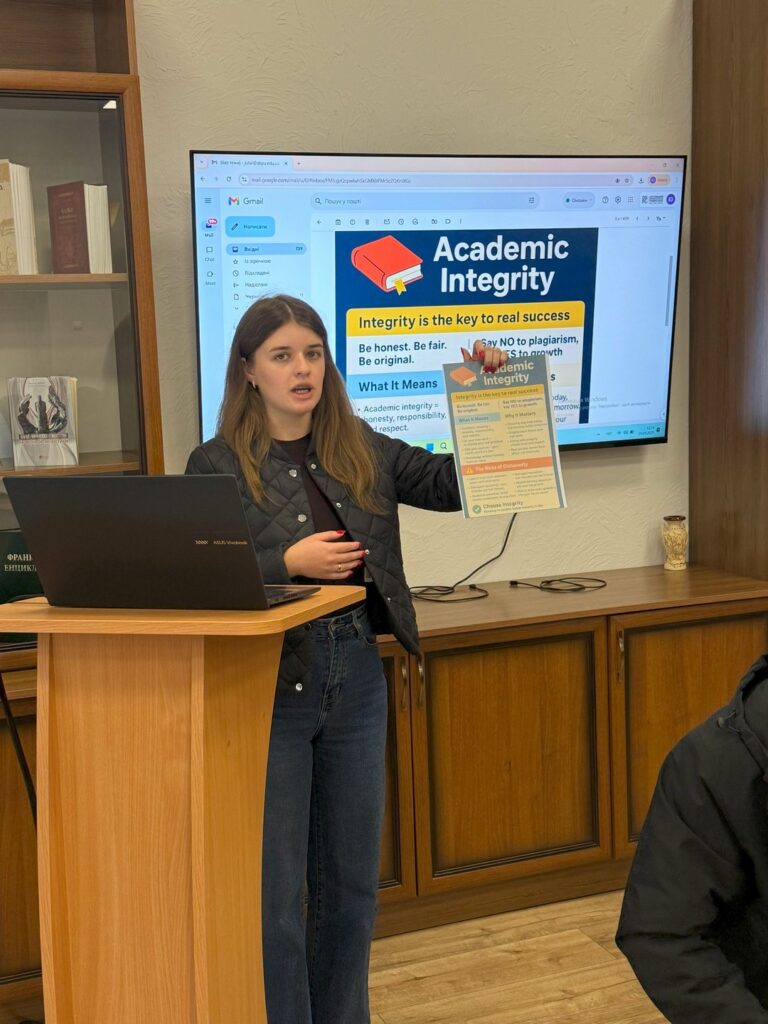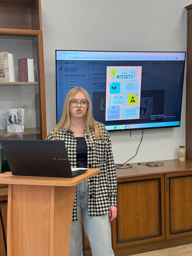 Учасниками заходу стали здобувачі другого (магістерського) рівня вищої освіти групи ПАН-2425М, які представили свої доповіді іноземними мовами. Під час обговорення студенти розглянули перспективи впровадження технологій штучного інтелекту в перекладацькій сфері, а також окреслили потенційні ризики для збереження академічної доброчесності.