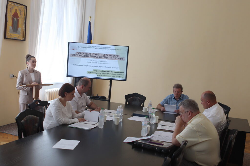 19 липня 2023 р. аспірантка кафедри історії України та правознавства Лілія Гриник успішно захистила дисертацію на здобуття наукового ступеня доктора філософії з галузі знань 03 Гуманітарні науки зі спеціальності 032 Історія та археологія. Тема дисертації: «Повсякденне життя українських повстанців на Прикарпатті (1940–1950-ті рр.)». Науковий керівник: доктор історичних наук, професор, завідувач кафедри історії України та правознавства Василь Ільницький.