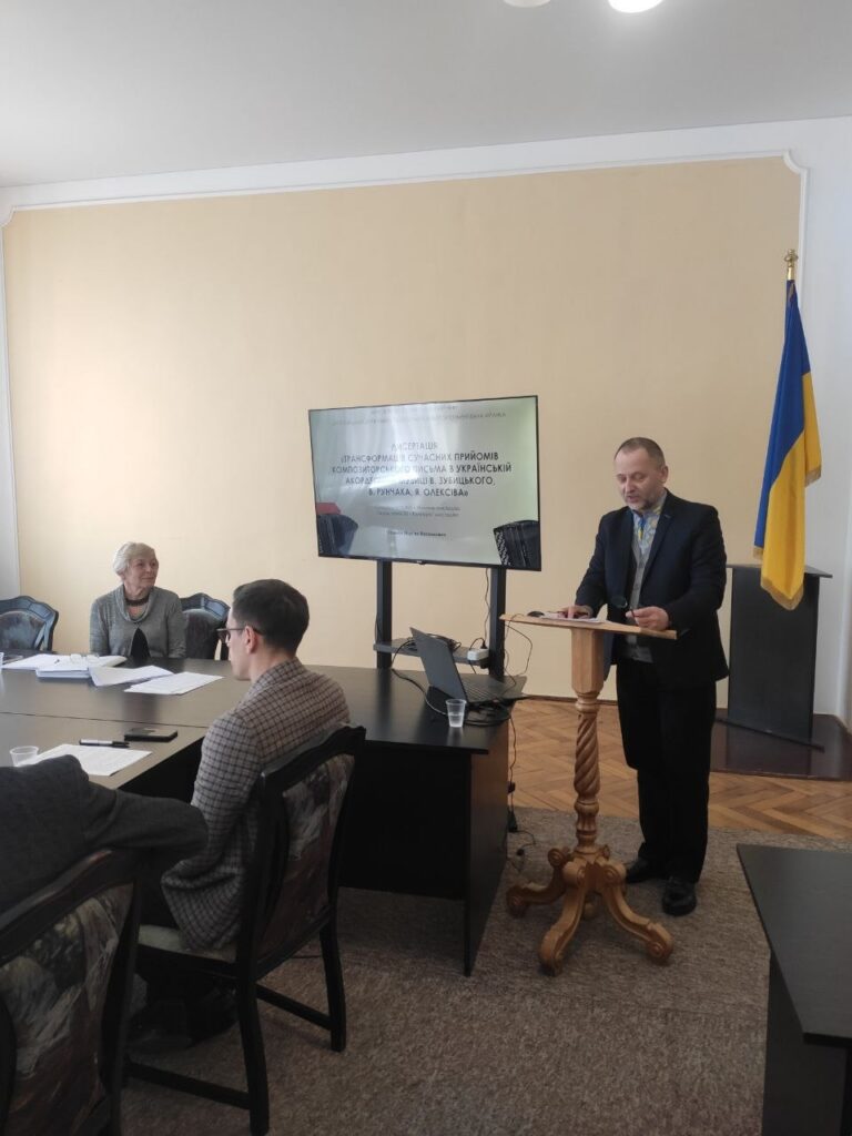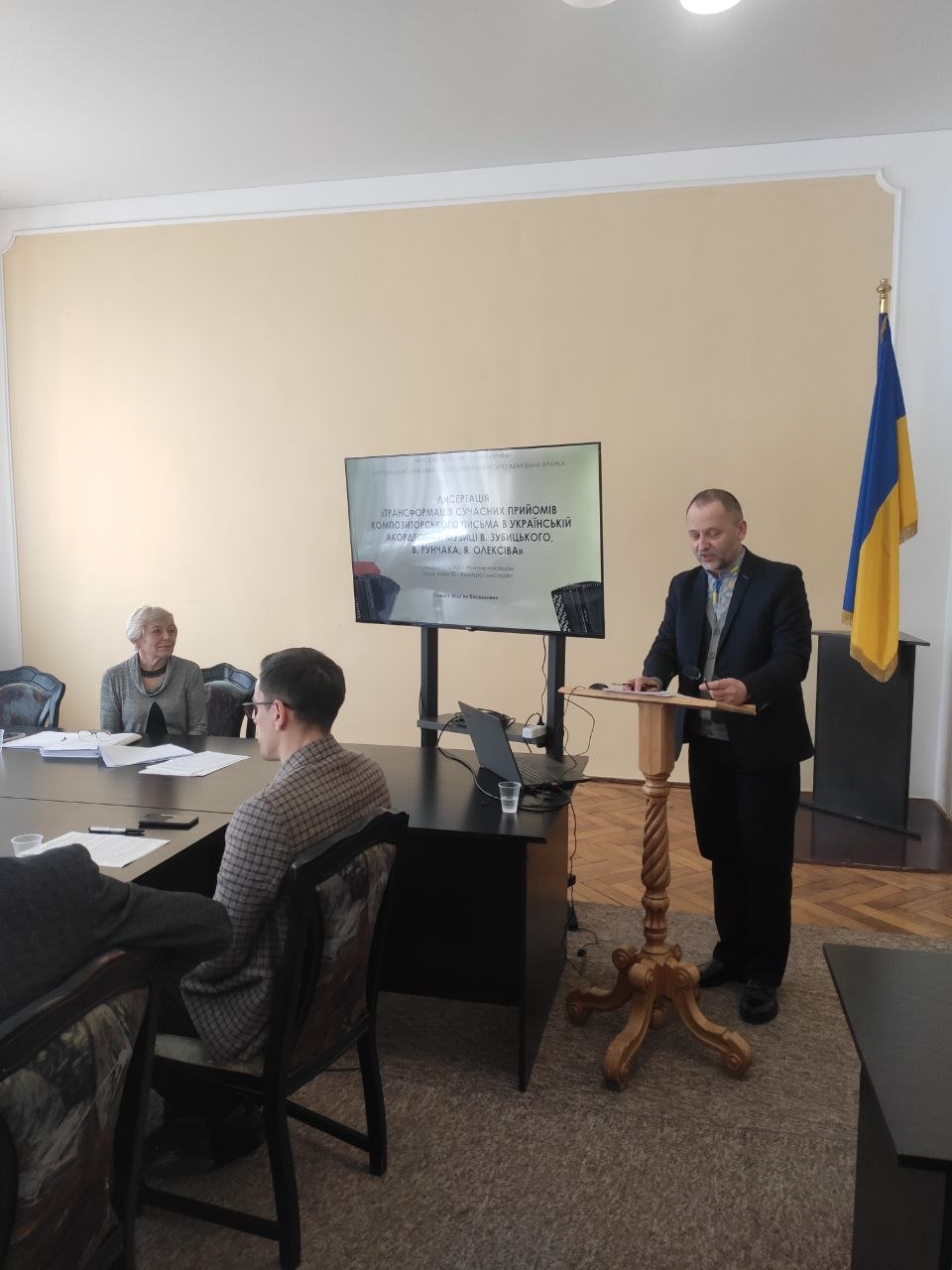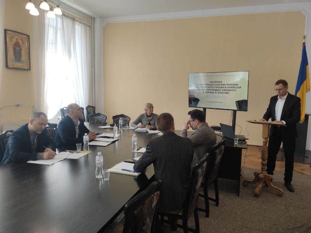 Захист відбувся на засіданні разової спеціалізованої вченої ради ДФ 36.053.039 під головуванням завідувачки кафедри вокально-хорового, хореографічного та образотворчого мистецтва, докторки мистецтвознавства, професорки Ірини Бермес.
