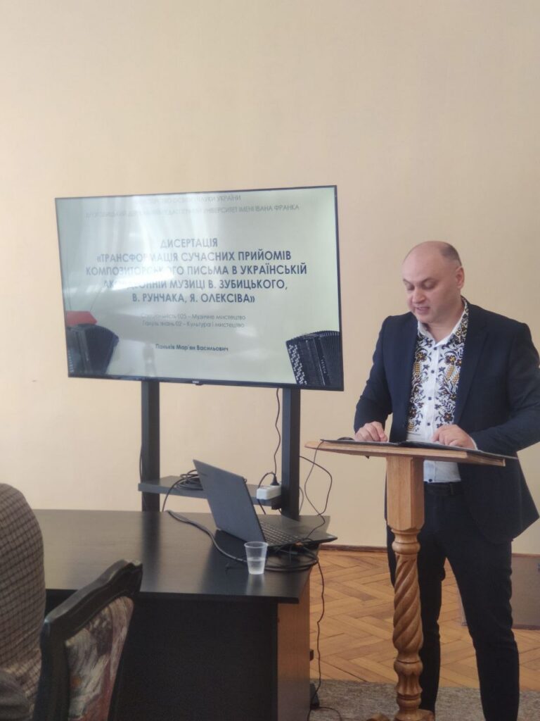 У Дрогобицькому державному педагогічному університеті імені Івана Франка 14 квітня відбувся успішний захист дисертації аспіранта кафедри вокально-хорового, хореографічного та образотворчого мистецтва Мар’яна Паньківа, який представив результати дослідження на тему: «Трансформація сучасних прийомів композиторського письма в українській акордеонній музиці В. Зубицького, В. Рунчака, Я. Олексіва» (наукова керівниця – доцентка Ірина Матійчин).