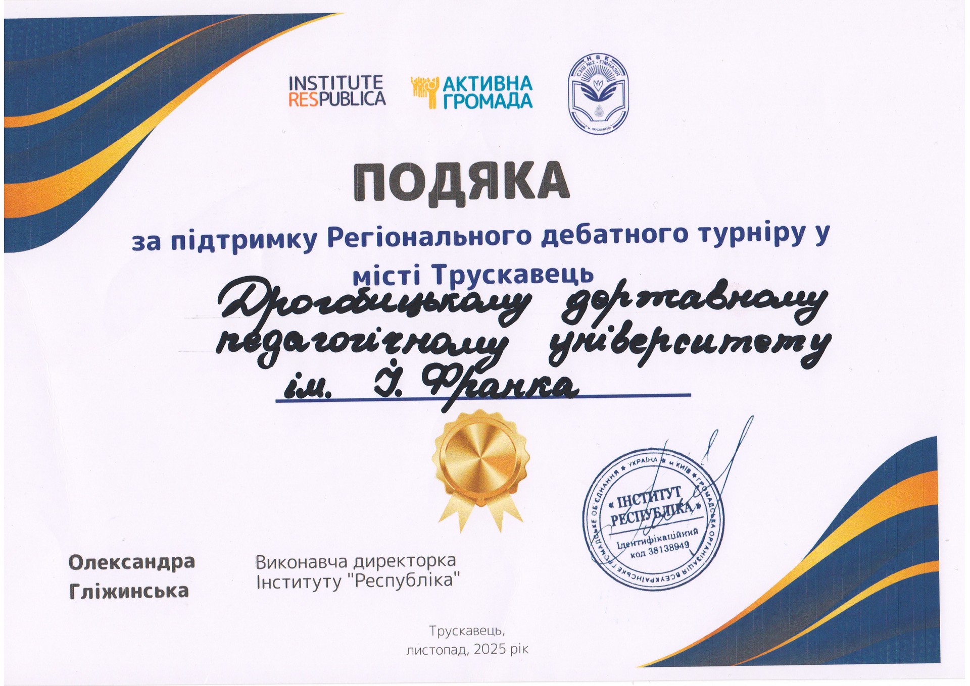 Всі учні отримали сертифікати учасника дебатів та подарунки, призери турніру нагороджені Кубками та цінними призами, зокрема найкращі учасники турніру отримали брендовані подарунки від Дрогобицького педагогічного університету.