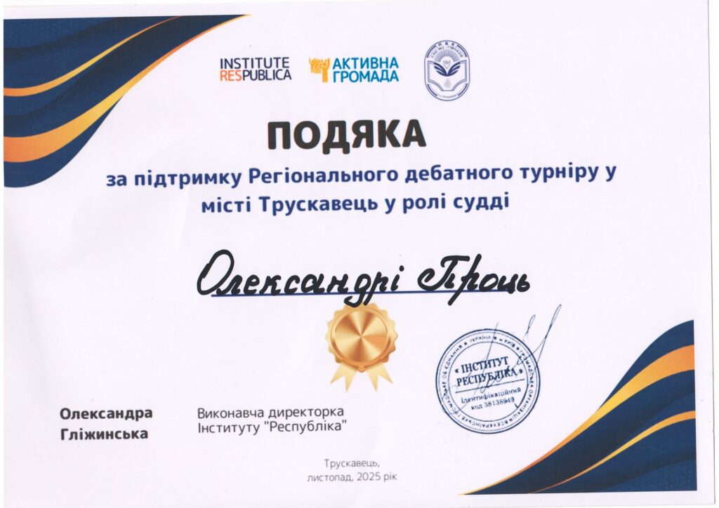 26 листопада на базі НВК «СЗШ №2-гімназія» у Трускавці відбувся Регіональний дебатний турнір, організований ВІ «Активна громада». У турнірі взяли участь 16 команд, до складу яких входило по 2 учнів закладів середньої освіти Трускавецької громади. Турнір проходив у Британському форматі парламентських дебатів.