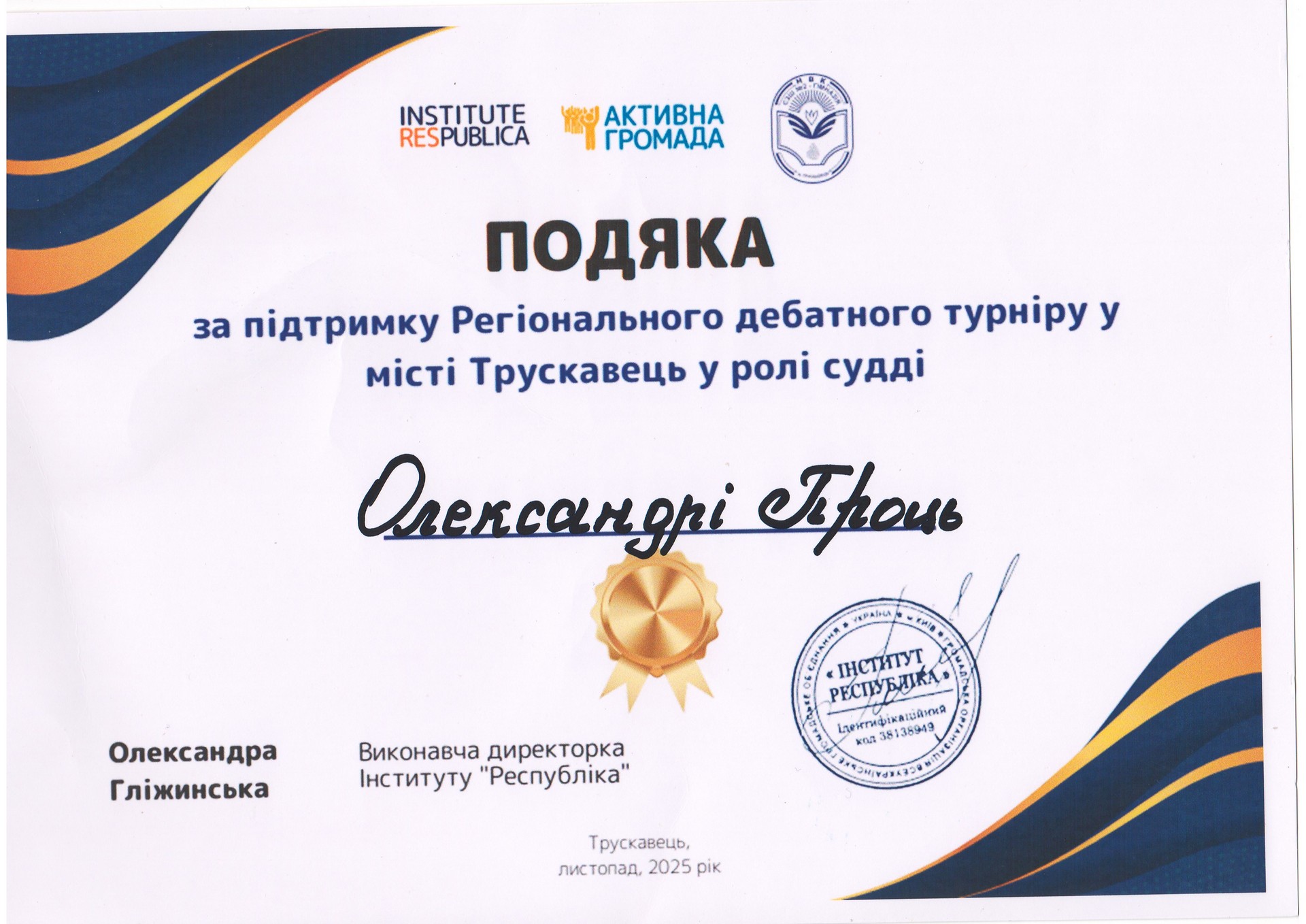 Під час дебатів учні продемонстрували не тільки знання матеріалу, але й згуртовану командну роботу. Виступи учнів оцінювало фахове журі, у складі якого була Олександра Проць – викладачка кафедри історії України та правознавства Дрогобицького державного педагогічного університету імені Івана Франка.