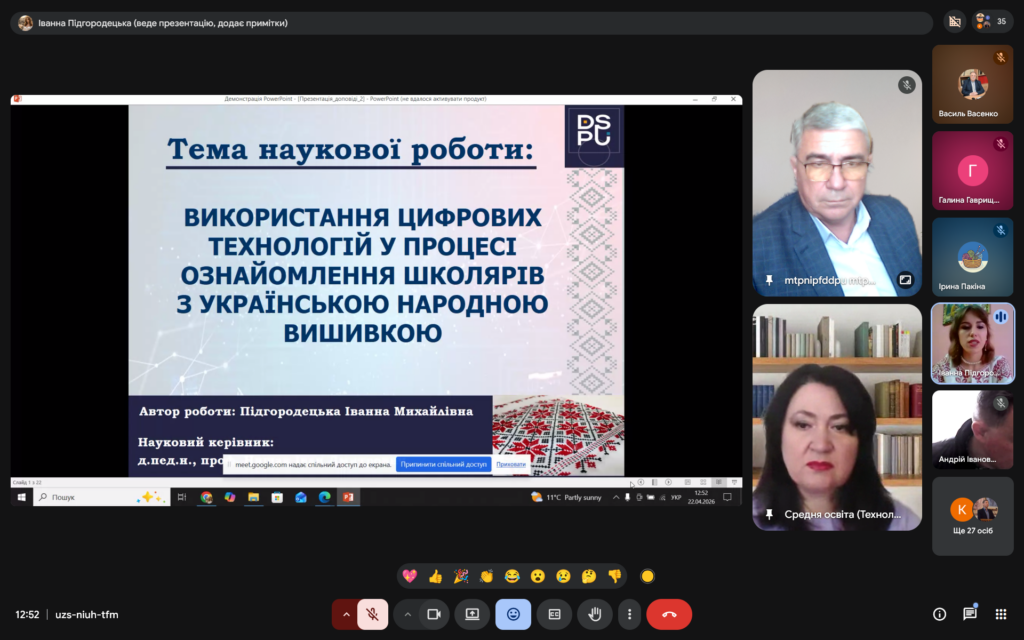 Особливу увагу конкурсної комісії привернув виступ студентки Дрогобицького державного педагогічного університету імені Івана Франка Іванни Підгородецької. Її наукова робота «Використання цифрових технологій у процесі ознайомлення школярів з українською народною вишивкою», виконана під керівництвом доктора педагогічних наук, професора Івана Нищака, стала яскравим прикладом того, як національні традиції можуть органічно поєднуватися з інноваційними освітніми підходами. Глибина дослідження, практична значущість і сучасне бачення теми переконливо засвідчили високий рівень наукової підготовки авторки.