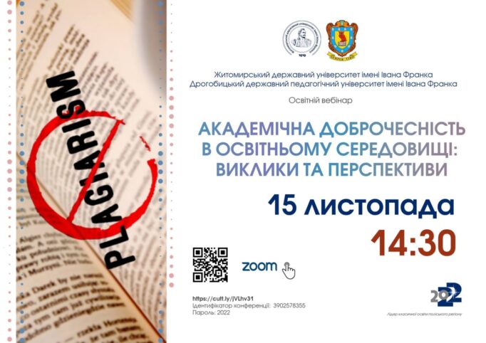 15 листопада 2022 року відбудеться освітній вебінар Житомирського державного університету імені Івана Франка та Дрогобицького державного педагогічного університету імені Івана Франка: “Академічна доброчесність в освітньому середовищі: виклики та перспективи”