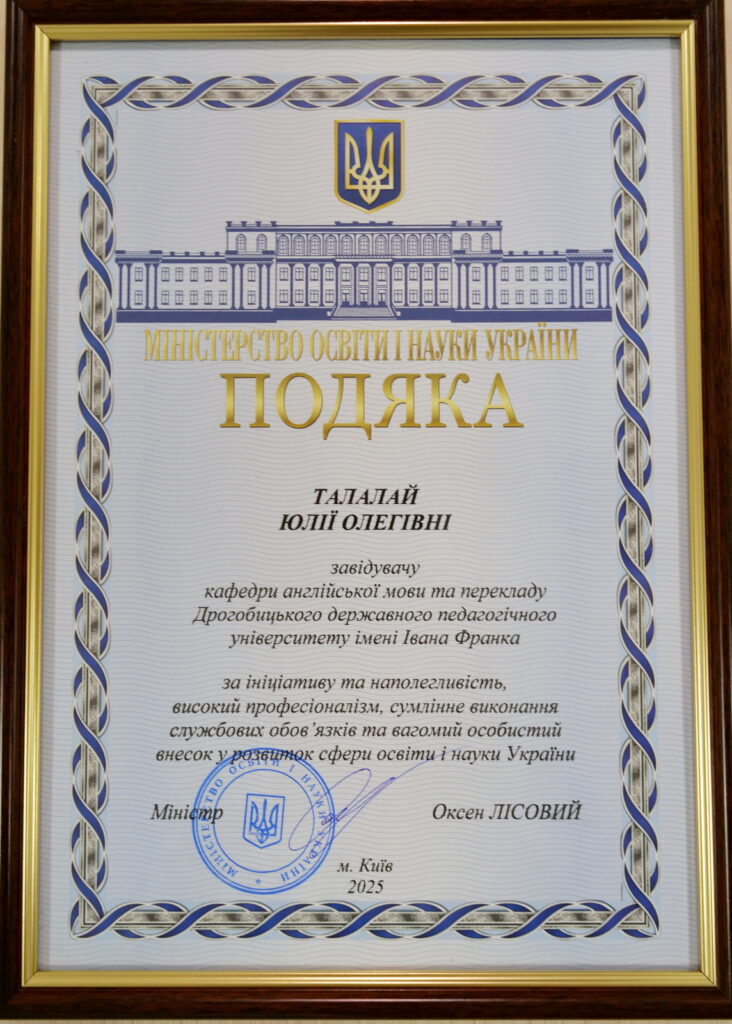 У межах засідання Вченої ради університету 27 листопада завідувачка кафедри англійської мови та перекладу Юлія Талатай отримала подяку Міністерства освіти і науки України за сумлінну працю й вагомий внесок у розвиток освіти.