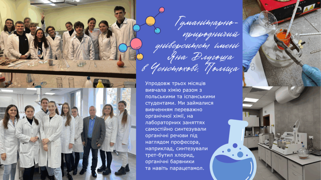 Ще в школі я захоплювалася біологією та хімією, тому не випадково вступила в університет. Але навчання – це не лише підручники й лабораторні роботи. Уже після першого курсу мені випав шанс взяти участь у програмі обміну Erasmus+, і я поїхала до Польщі вивчати органічну хімію разом із студентами з різних країн, а саме з Польщі та Іспанії. Там ми самостійно синтезували речовини, зокрема органічні барвники та парацетамол! Це був лише початок.