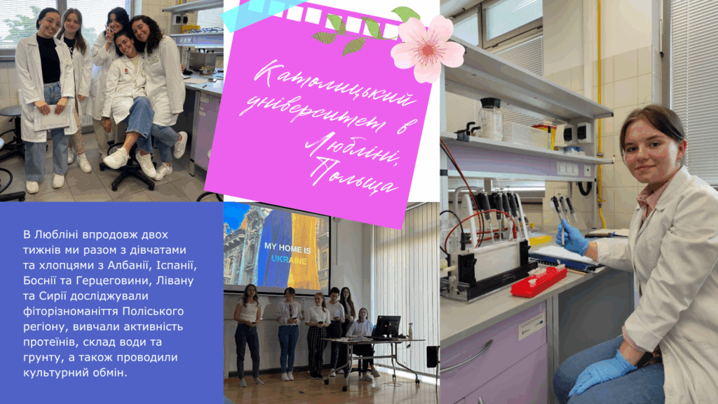 Далі були короткострокові стажування в Любліні та Легніці. В Любліні разом з дівчатами та хлопцями з Албанії, Іспанії, Боснії та Герцеговини ми досліджували фіторізноманіття Поліського регіону, активність протеїнів, склад води та грунту, а в Легніці разом із польськими студентами організовувала фестиваль української культури, де збирали кошти на потреби українців.