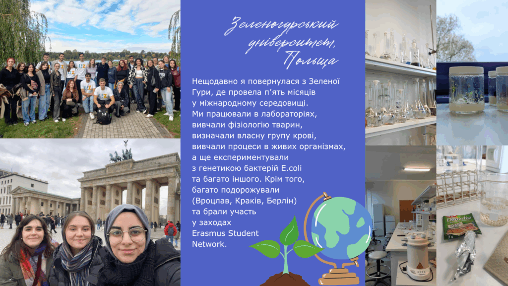 Нещодавно я повернулася з Зеленої Гури, де провела п’ять місяців у міжнародному середовищі. Ми працювали в лабораторіях, вивчали фізіологію тварин, визначали власну групу крові, вивчали процеси в живих організмах, а ще експериментували з генетикою бактерій E.coli та багато іншого. Крім того, багато подорожували (Вроцлав, Краків, Берлін) та брали участь у заходах Erasmus Student Network (інтернаціональна вечеря, Goodbye party) Англійська стала невід’ємною частиною мого життя, і я навіть склала TOEFL на 90 балів.