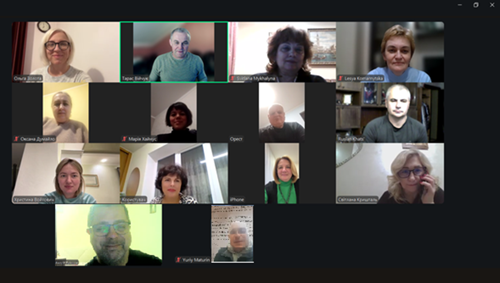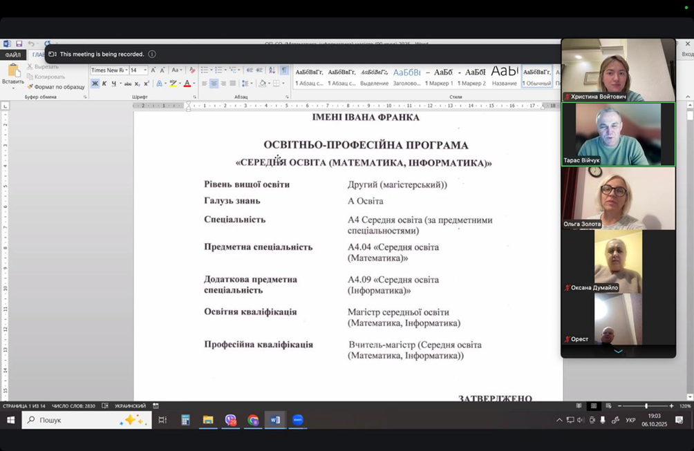 10 березня відбулась зустріч із зовнішніми стейкхолдерами в режимі онлайн на платформі Zoom. До обговорення долучились: начальник відділу освіти, молоді та спорту Давидівської сільської ради Львівської області Світлана КРИШТАЛЬ, директор комунального закладу Львівської обласної ради “Львівський науковий ліцей №1 імені Б.-І. Антонича” Орест ІВАСЬКІВ, директор середньої загальноосвітньої школи №30 м. Львова Світлана МИХАЙЛИНА, вчитель математики та інформатики, заступник директора з навчально-виховної роботи СЗШ 50 І-ІІІ ст. м. Львова Ірина ПАСТЕРНАК, вчитель математики та інформатики, методист КЗ ЛОР “Обласний науковий ліцей” Оксана ДУМАЙЛО, вчитель математики ліцею №1 імені Івана Франка м. Дрогобича Марія ХАЙНУС, вчитель інформатики НВК “СЗШ N2 – гімназія” м. Трускавець Андрій ТРІЩУК. Під час виступів стейкхолдери відзначили високий рівень освітніх програм та наявність компонентів, що сприяють формуванню компетентностей, необхідних сучасному вчителю математики та інформатики. Водночас, у ході дискусій, було згенеровано ідеї щодо вдосконалення змісту обговорюваних освітньо-професійних програм і рекомендації щодо змісту навчальних дисциплін.